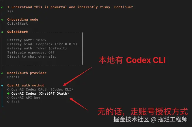 当你安装成功之后,会问你是否知道 Clawdbot 的风险很高,选择 yes 之后,就可以继续。