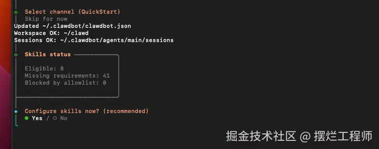 后面就会给你一些 Skills,你可以按需选择,或者先跳过也可以。 后续都可以安装的,直接跟 Clawdbot 说安装对应的 skills 就行。