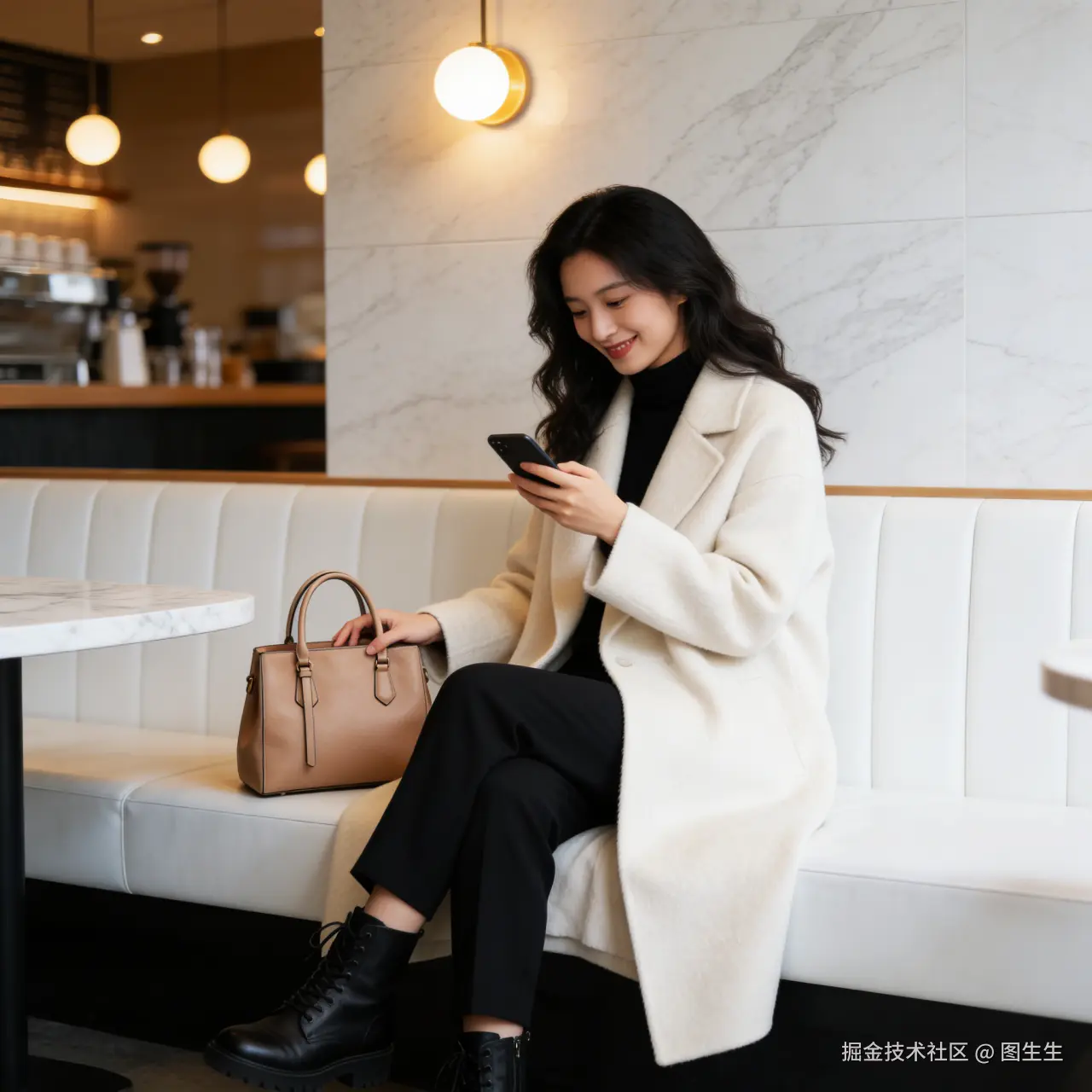 写实风格,一位温柔优雅的东亚长发微卷年轻女性,身穿米白色长款羊毛大衣、黑色高领内搭、黑色西装裤和黑色马丁靴。她惬意地坐在现代简约咖啡馆的白色皮质卡座上,背景是大理石墙面和暖光氛围灯。她低头看着手机微笑,手轻扶着这款包。背景有大理石桌面和模糊的咖啡吧台。