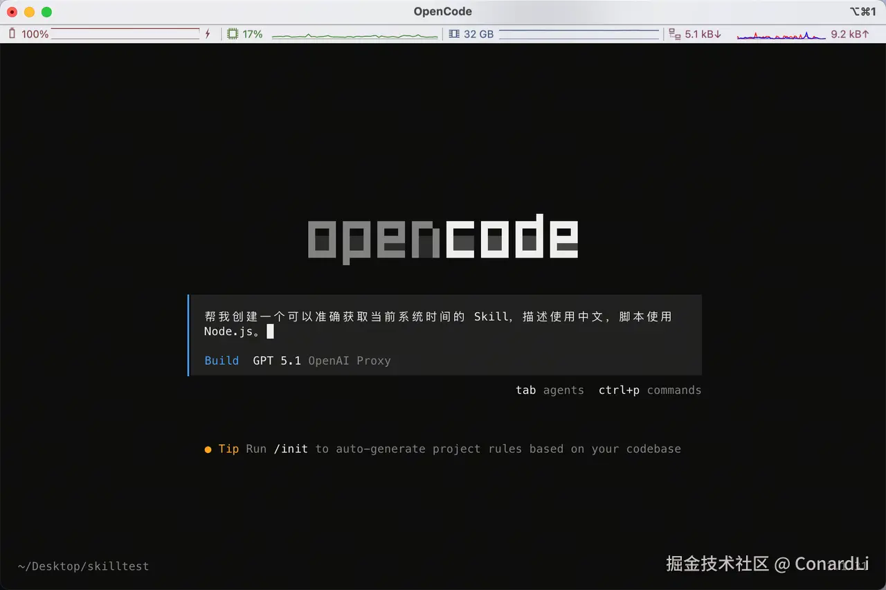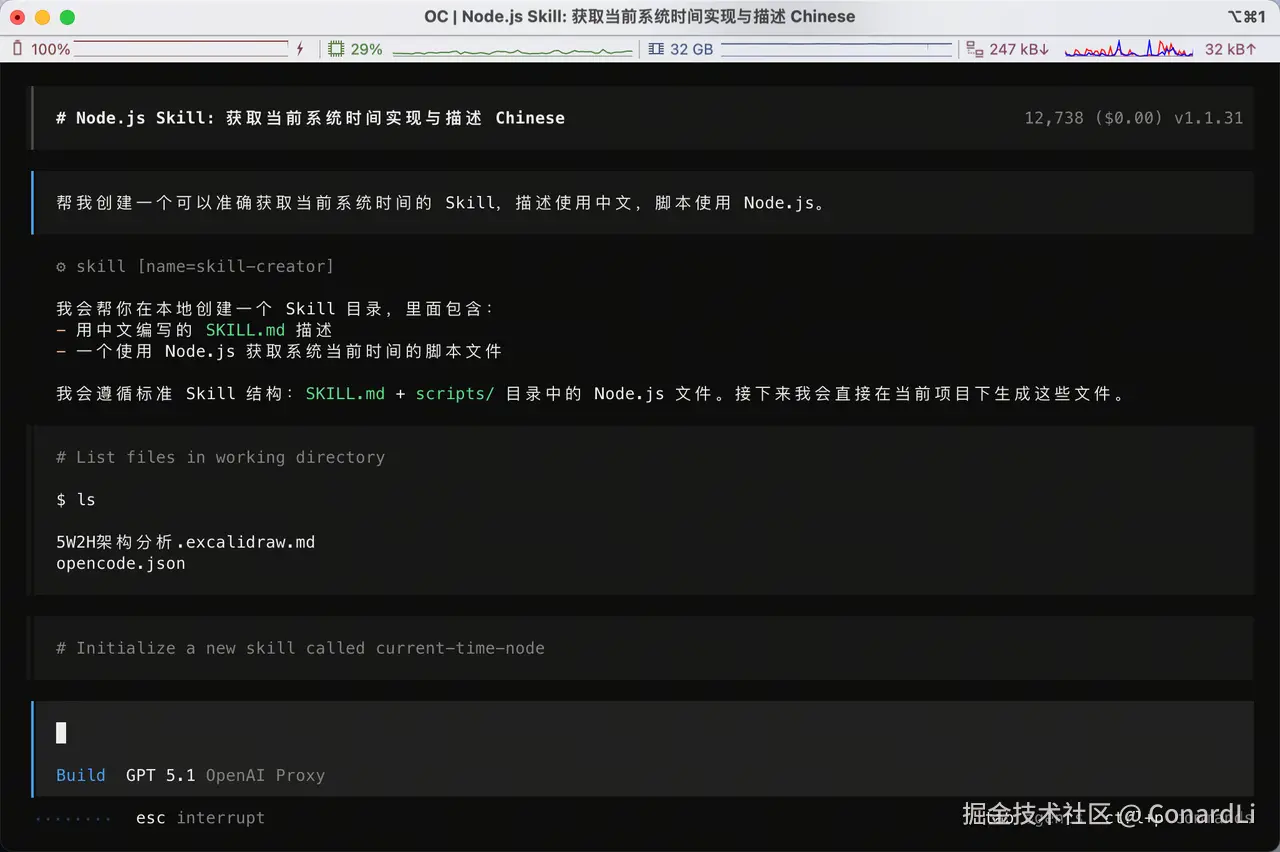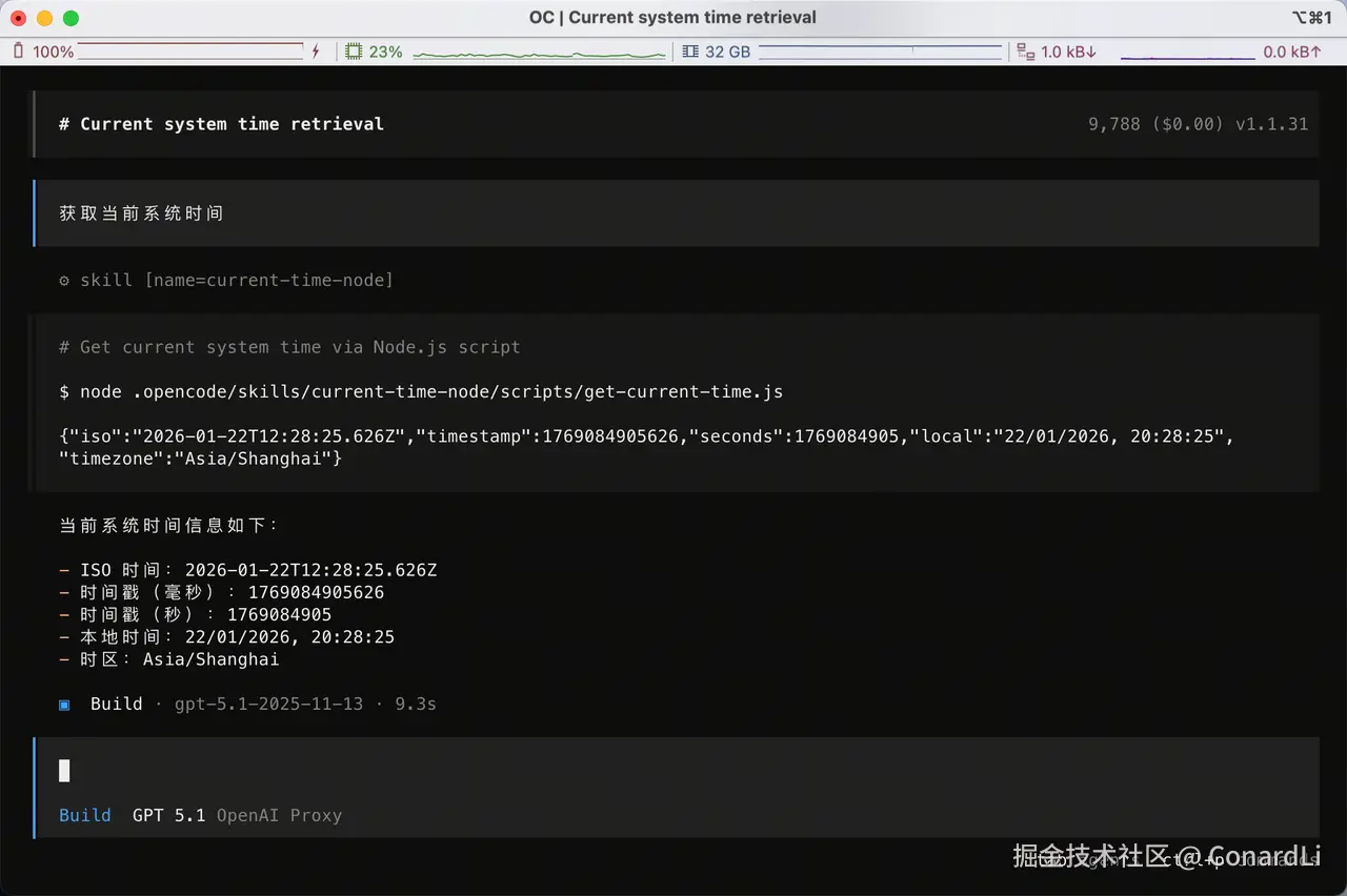 接下来,我们询问 opencode:“获取当前系统时间”,然后它就会自动找到刚刚生成的 Skill 并调用里面的脚本: