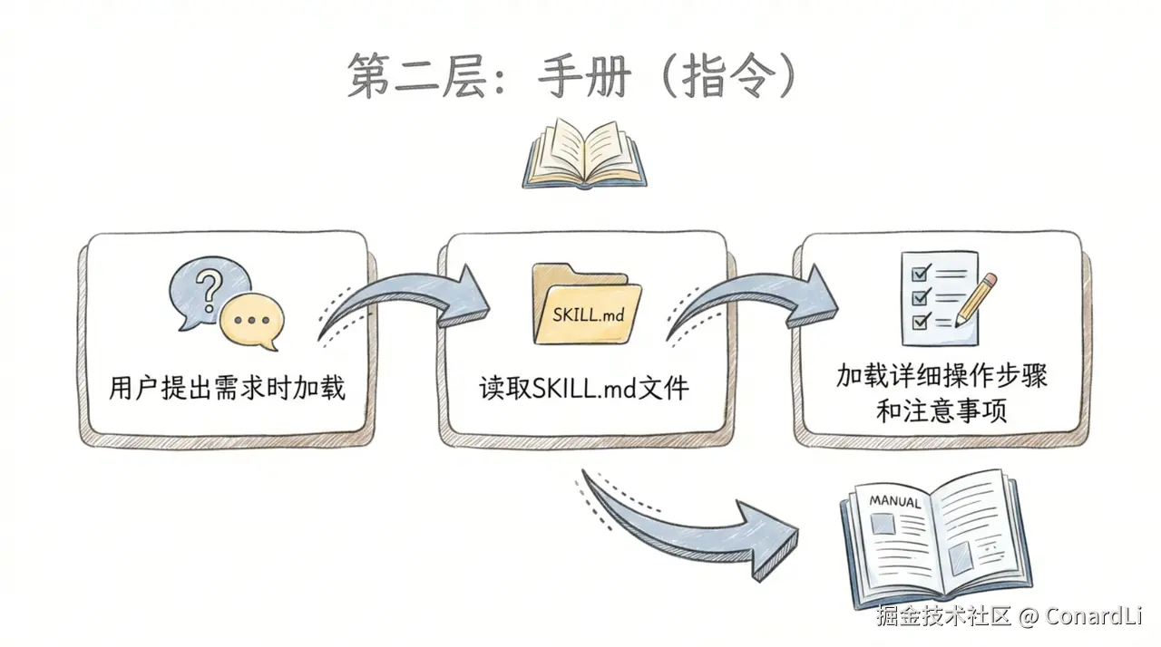 这是我觉得 Agent Skills 设计得最聪明的地方。你可以把它想象成我们在图书馆查资料的三个步骤,非常直观: