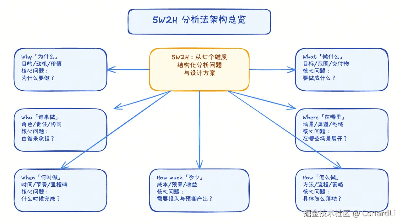 帮我绘制一个架构图,讲解什么是 5W2H 分析法,直接帮我在当前目录下生成一个 excalidraw 文件。