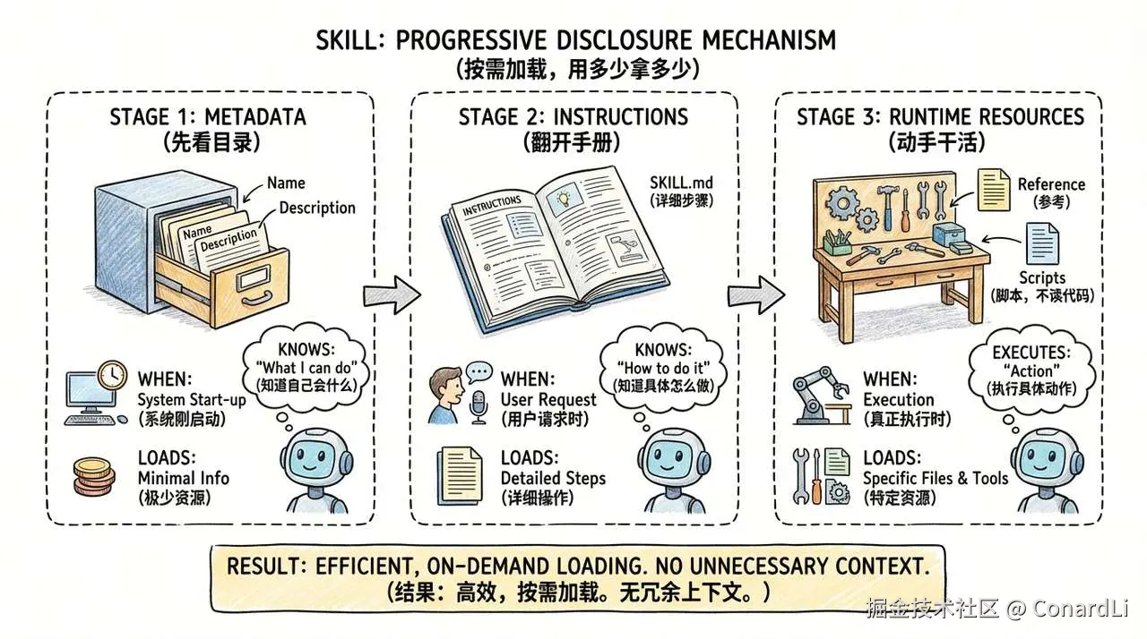 Skill 的出现就是为了解决这种问题,它有一个非常核心的机制,叫渐进式披露(Progressive Disclosure)。说人话就是:按需加载,用多少拿多少。