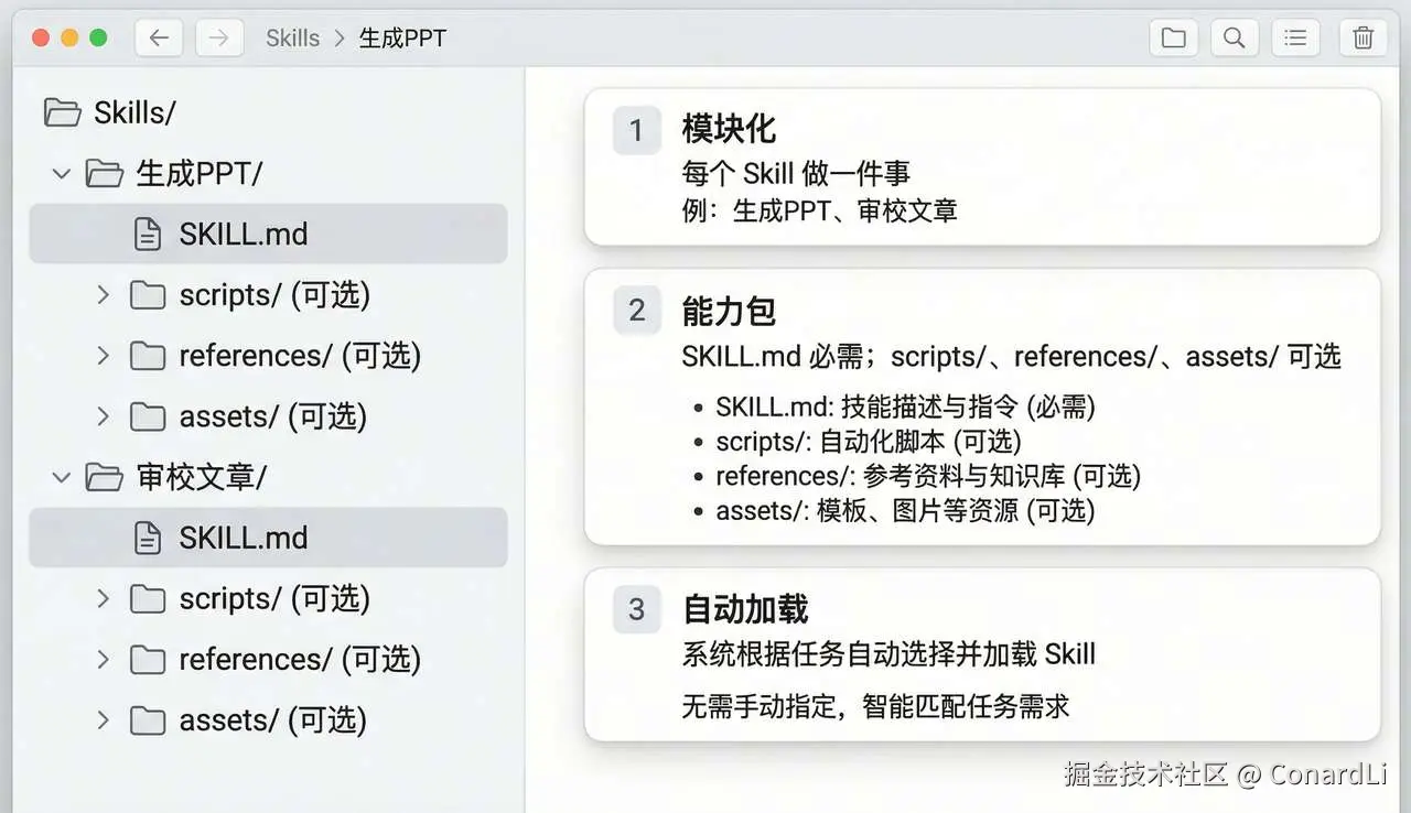 简单来说,Skills 的作用就是将那些重复性的、专业的流程进行打包封装。当你需要使用某种能力时,不再需要像过去那样每次都去查阅手册或重新输入冗长的提示词,而是像调用工具一样直接使用。