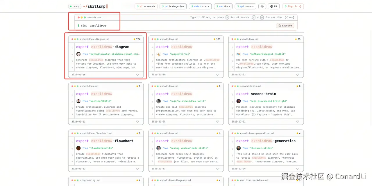 可以看到社区已经有大量 Excalidraw 的 Skill 了,我们这里选择 Star 最多的一款: