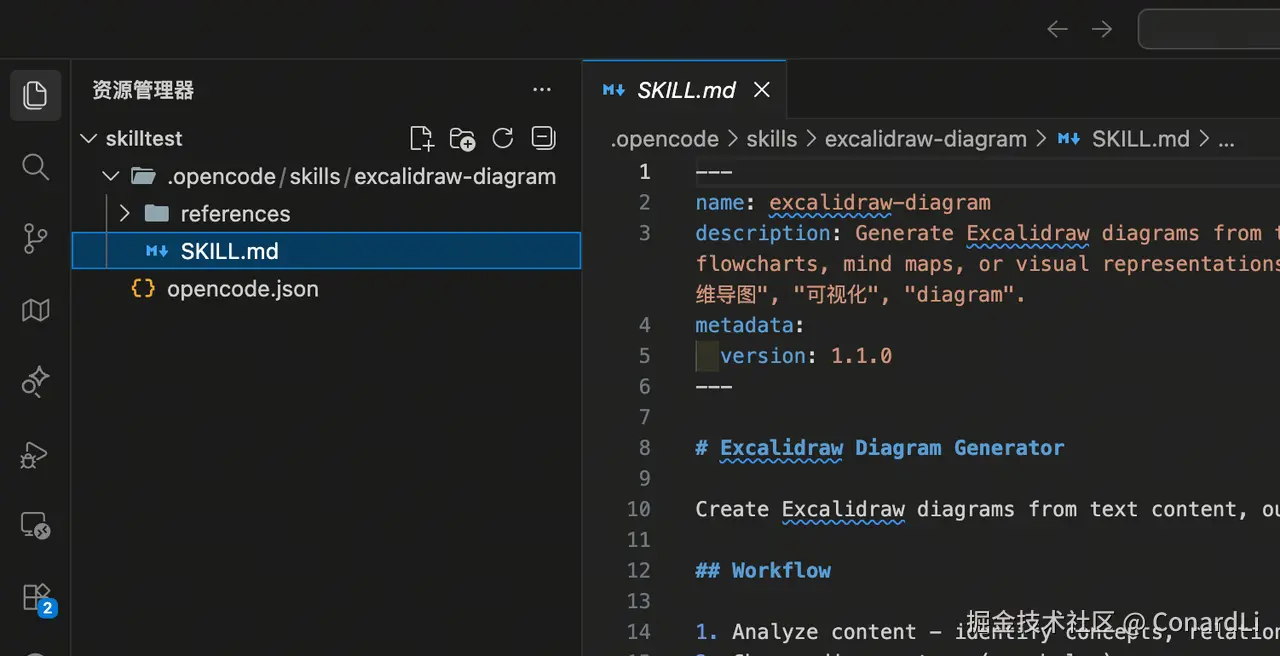 接下来,按照刚才的流程,我们把这个 Skill 下载下来,放到 .opencode/skills 目录下: