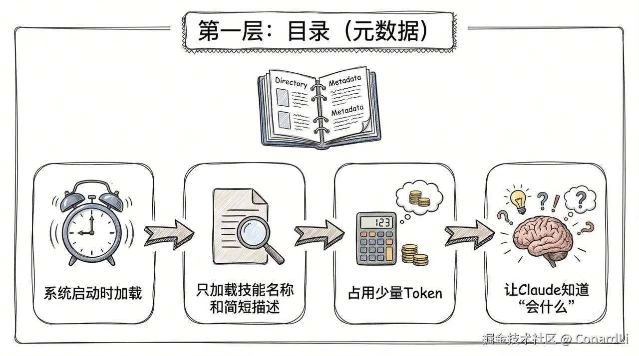 - 有什么用? 这一层占用的资源极少,可能就几百个 Token。它的作用就是告诉 Claude:“嘿,你的工具箱里有‘查周报’、‘处理 Excel’ 这几个工具哦。”