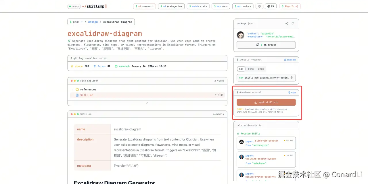进入详情后,我们选择一个最简单的安装方式,直接把这个 Skill 下载到本地,点击 wget skill.zip: