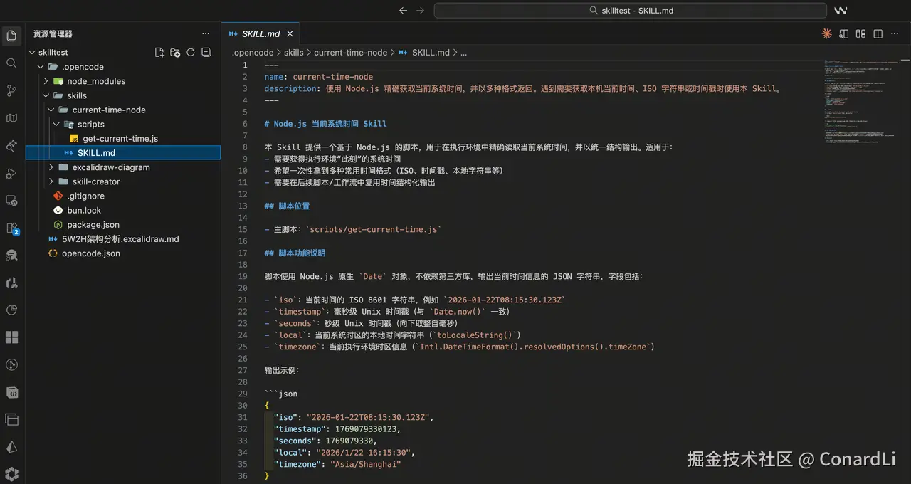 然后我们打开本地的 .opencode/skills 目录,发现多了一个 current-time-node skill,包含一个 SKILL.md 加一个获取准确时间的 Node.js 脚本:
