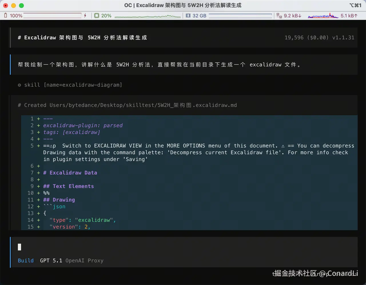 你不需要手动去 “安装” 或 “运行” Skill,只要文件放对位置了,OpenCode 的 AI 就会自动根据用户的需求判断要调用这个 Skill,然后帮我生成了代码: