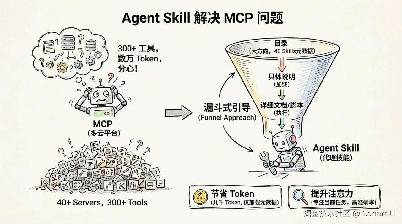 而我们上面讲到的 Skills 的核心机制:渐进式披露 ,恰好可以解决这两个问题: