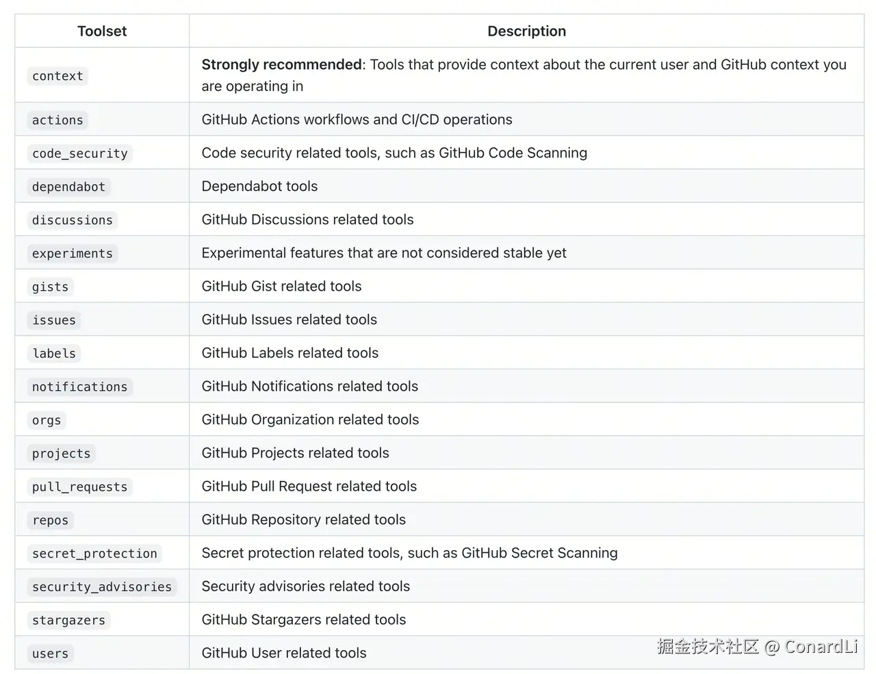 每个 MCP Server 一般都会包含大量的工具,比如 Github MCP ,它自己就包含了 30 多个工具:
