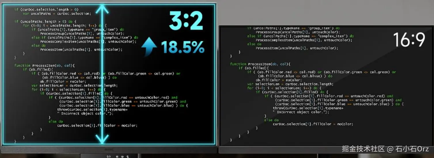 宽高比表示屏幕宽度与高度的比例。目前大多数人使用 16:9 屏幕,也有人选择 21:9 的超宽屏,但在开发场景下,21:9 的带鱼屏往往利用率不高,一行代码虽多,但垂直空间有限,不如多行显示直观。相比之下,3:2 屏幕在垂直显示上更友好,一次可以看到更多代码行,更利于阅读和对比。