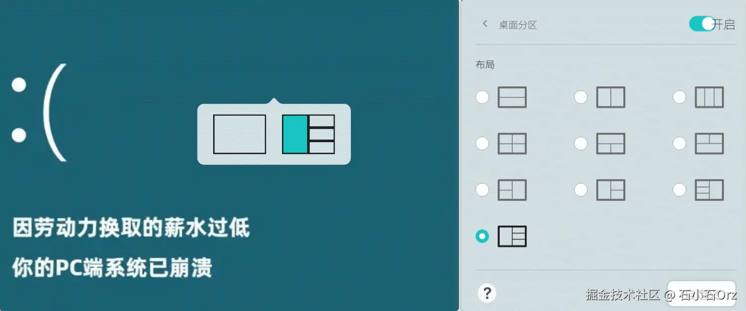 相比 Windows 自带的分屏方式,它的分区模式更多,而且支持自定义。 我们可以按照自己的开发习惯,调整分区大小,更有效的利用空间。
