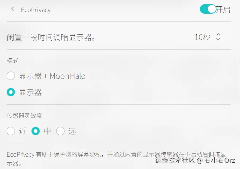这个功能我觉得挺有意思的:当你离开工位时,显示器会通过传感器自动关闭屏幕;等你回到座位前,屏幕又会自动亮起,并提示Welcome。虽然我没什么隐私要保护,但这个功能我觉得还是很不错的。