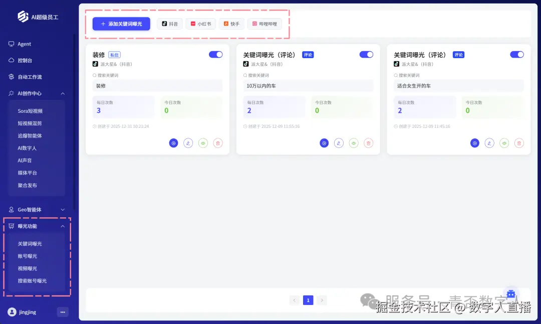 关键词曝光:通过关键词检索目标视频,AI自动在视频下评论,或在评论区匹配关键词后自动私信用户。