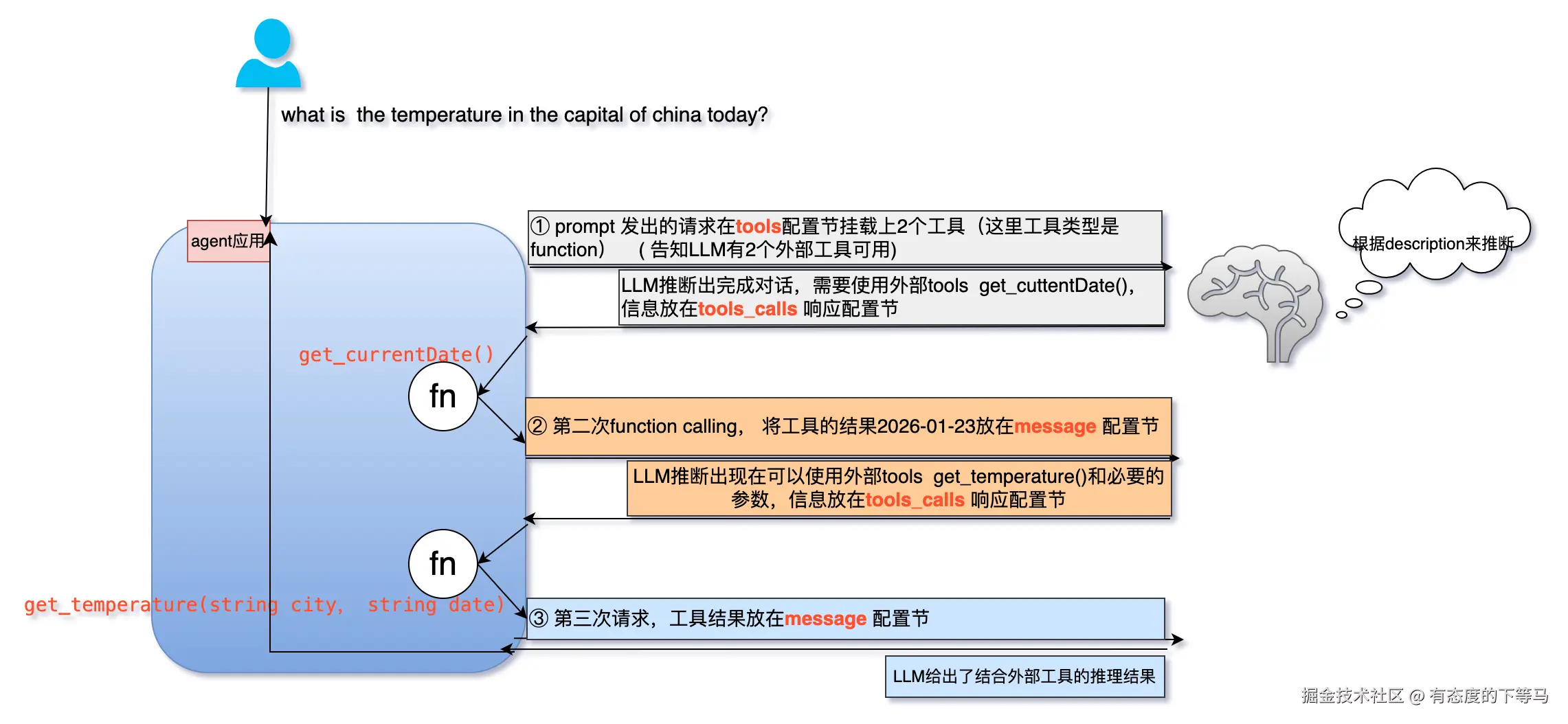 - 它再次思考:“日期有了,温度也有了,我可以直接回答用户了。”(输出 不包含 ToolCall)