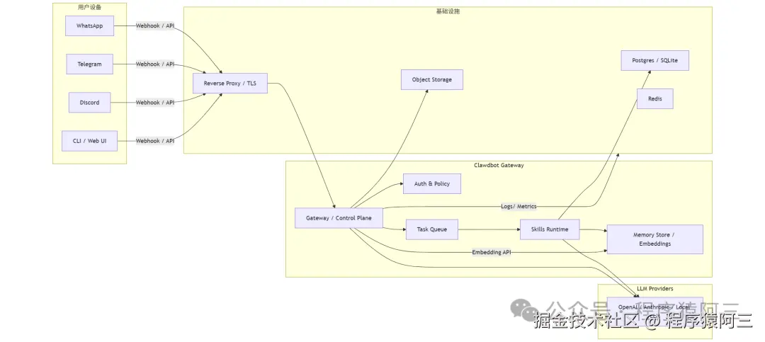 总得来说,它技术架构:三层/模块化架构(Control Plane + Channels + LLM)