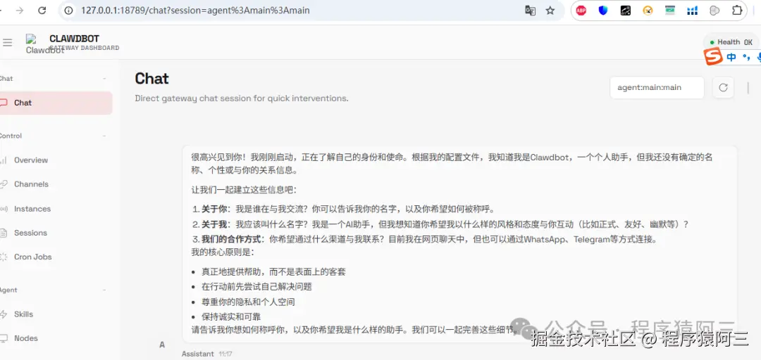 按照步骤要求完成所有配置,就可以打开http://127.0.0.1:18789/chat(注意根据每个人配置端口不一样,要求不一样),进行对话。