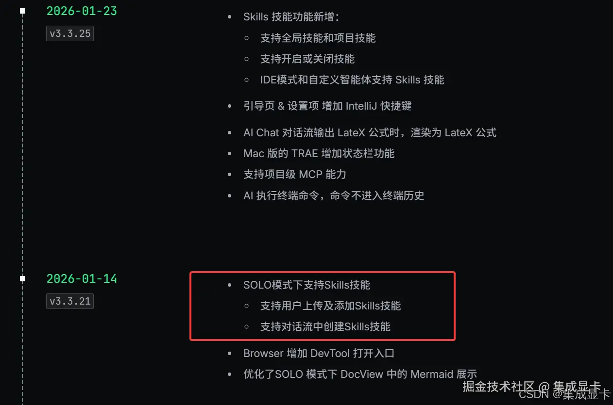 Trae CN 在 2026年1月14日发布的新版本支持 Skills,详见官方文档。