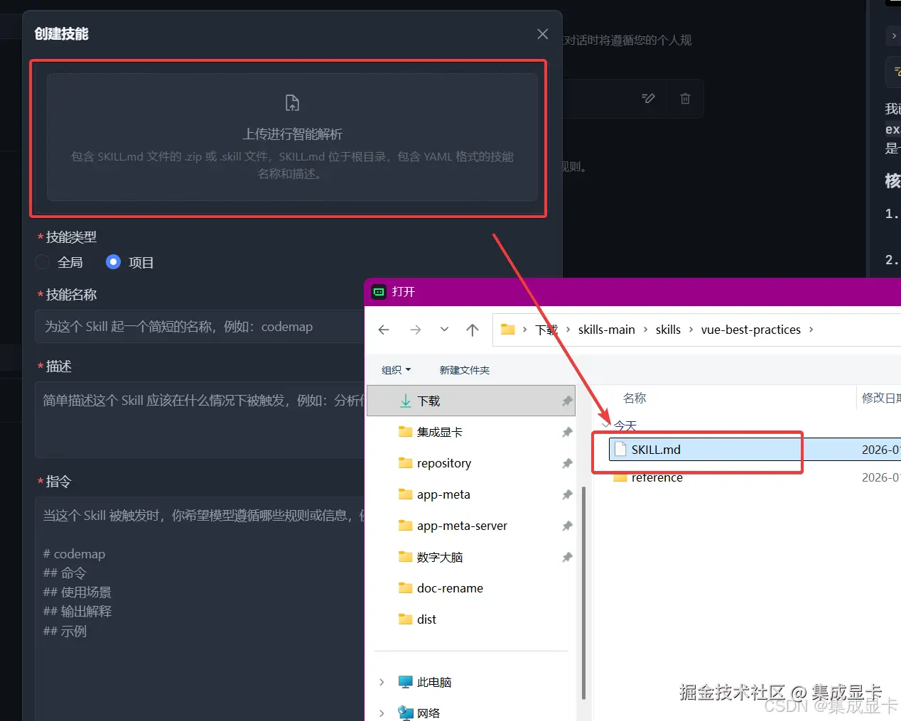 在弹出的对话框,点击上传,选择下载好的skills.md。