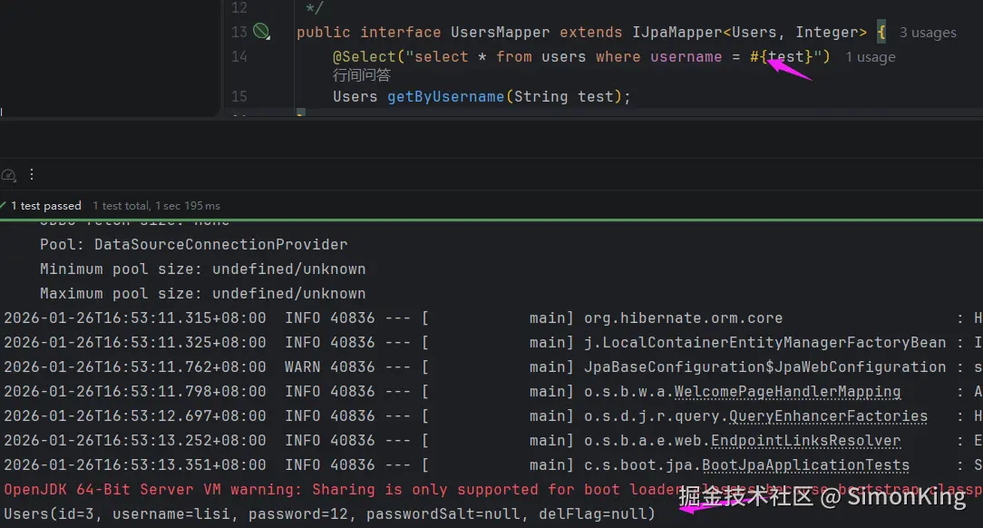 这里的Mapper可以使用@Mapper注解,也可以使用@MapperScan("com.simonking.boot.jpa.mapper")放在启动类上。