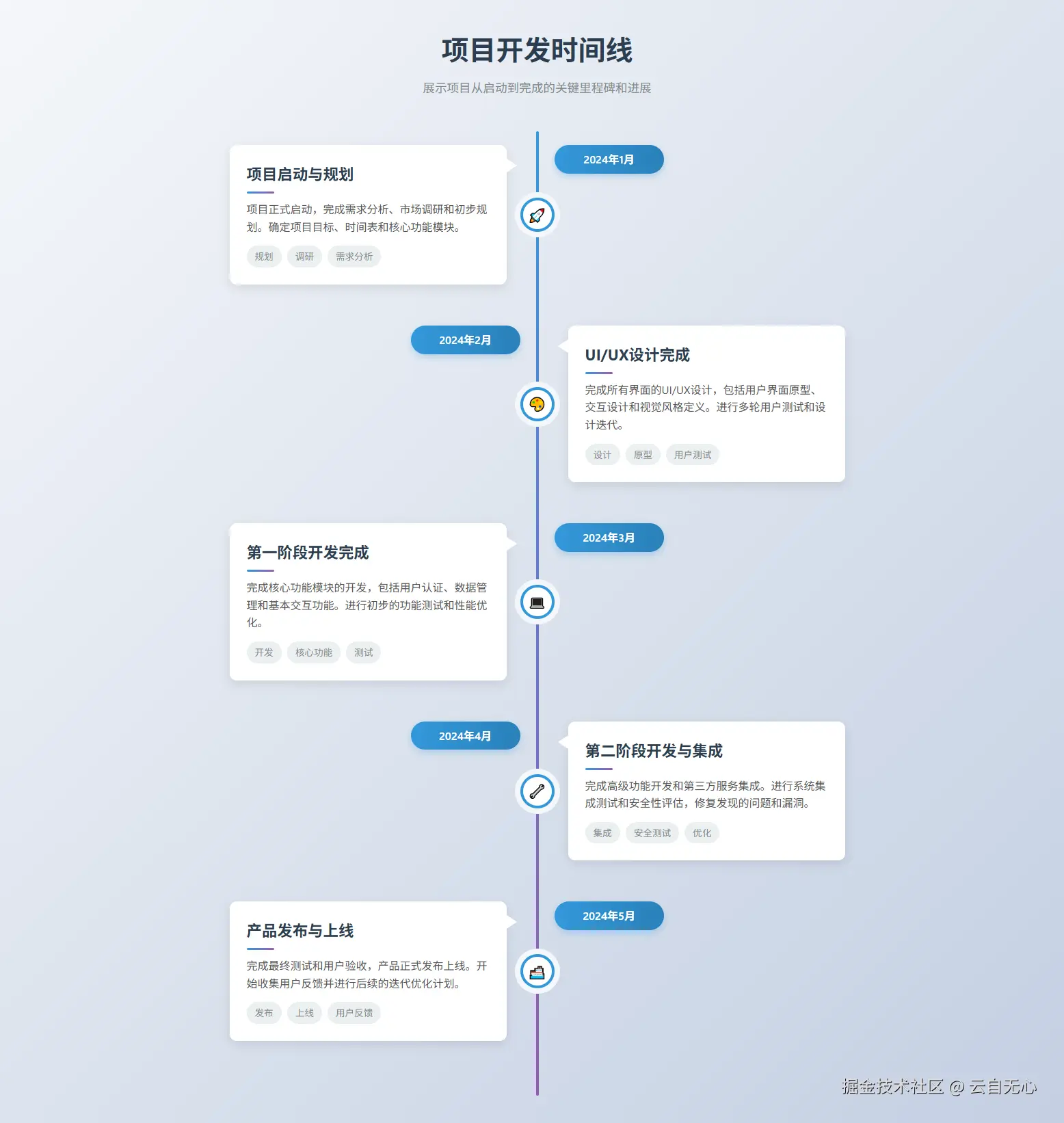 • 每个节点包含:日期、内容、图标