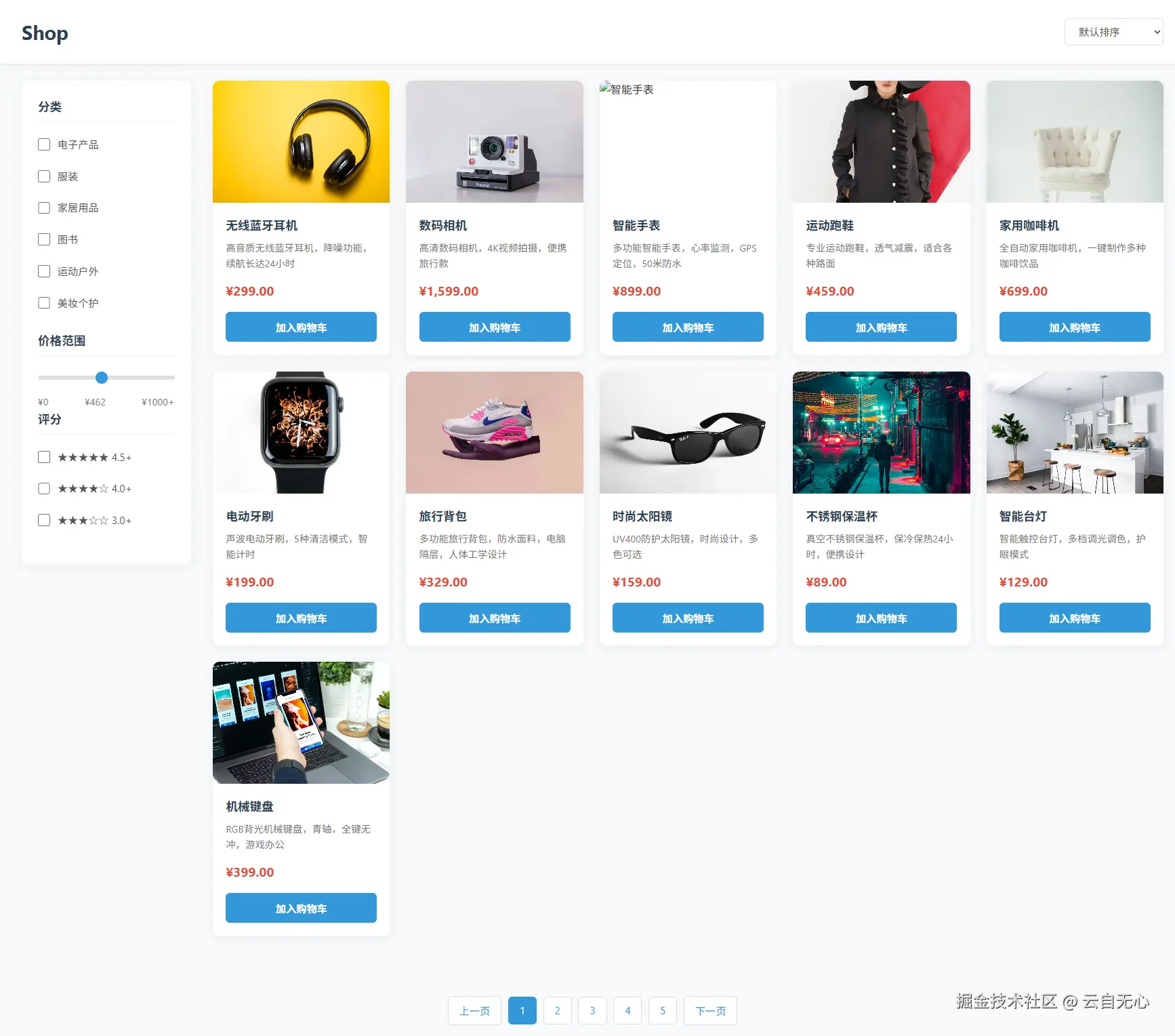 • 产品卡片包含:图片、标题、价格、加入购物车按钮