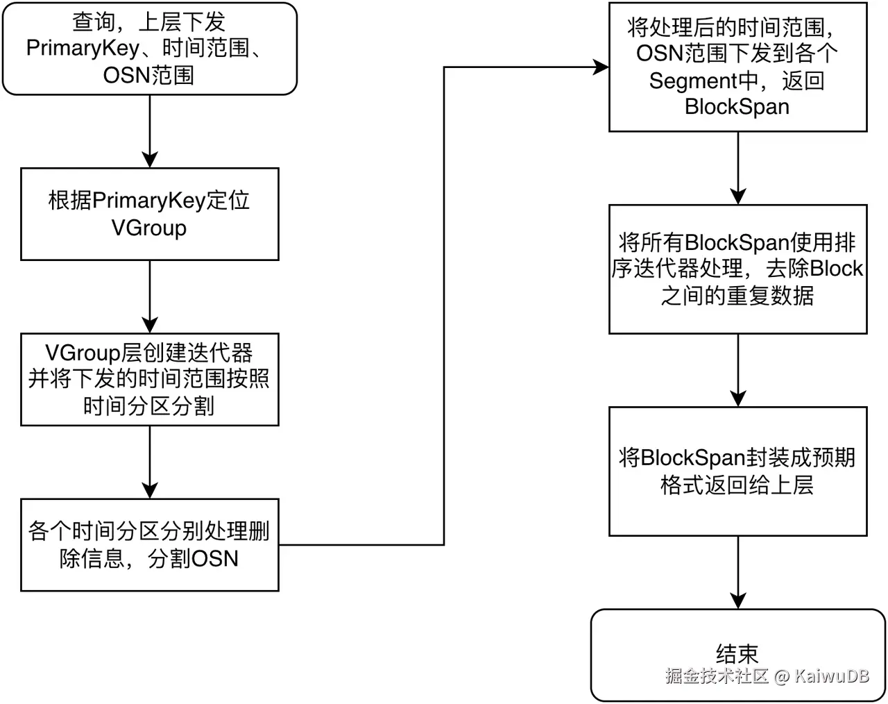 进行查询时,存储层首先按照下发的时间范围来过滤满足的时间分区,在对应的分区下逐级查询当前可见的 MemSegment、LastSegment 和 EntitySegment。此时各结构中每个 Block 内部的数据均按照设备号和时间戳升序排列。在返回给上层执行层前,这些 Block 会再经过归并排序来处理 Block 之间的重复数据,最终将经过处理的 Block 组织成合理的数据格式再返回给上层。查询的逻辑如下: