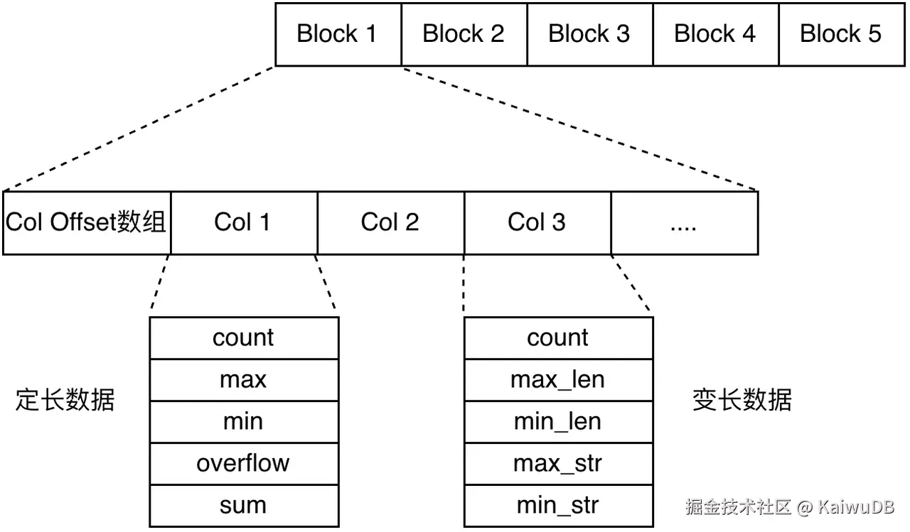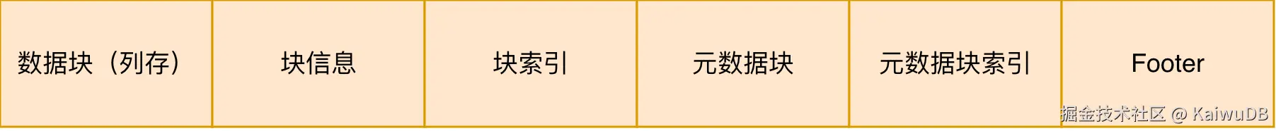 其中数据块部分用于存放列存数据,块信息部分存储如何解析数据块(记录每块中每列的偏移,数据条数等),块索引记录简单的聚合信息用于查询时的快速过滤,元数据块为可选项,以提供部分拓展支持,Footer 用于记录索引块的数量和偏移。