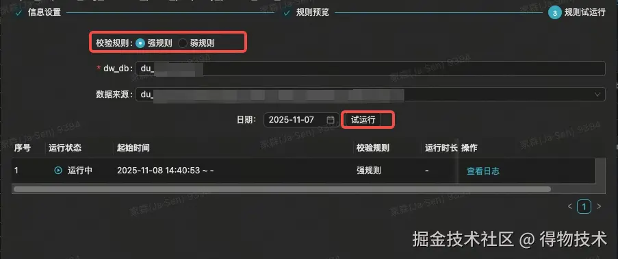 所有DQC配置完成后,需要通过试运行之后才能保存上线,确保DQC配置的合理性、有效性。