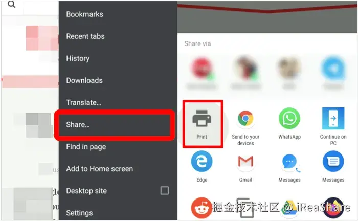 在 Android 手机的网络浏览器中打开 XML 文件,然后点击右上角的三个垂直点。选择“共享”>“打印”。