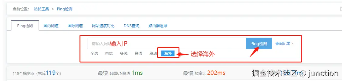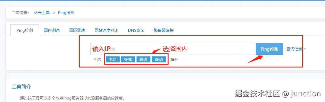 ping 测试分为国内和国外,可以使用在线工具进行检测,如站长工具:ping.chinaz.com/