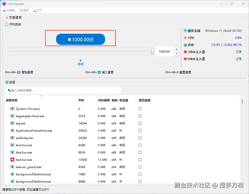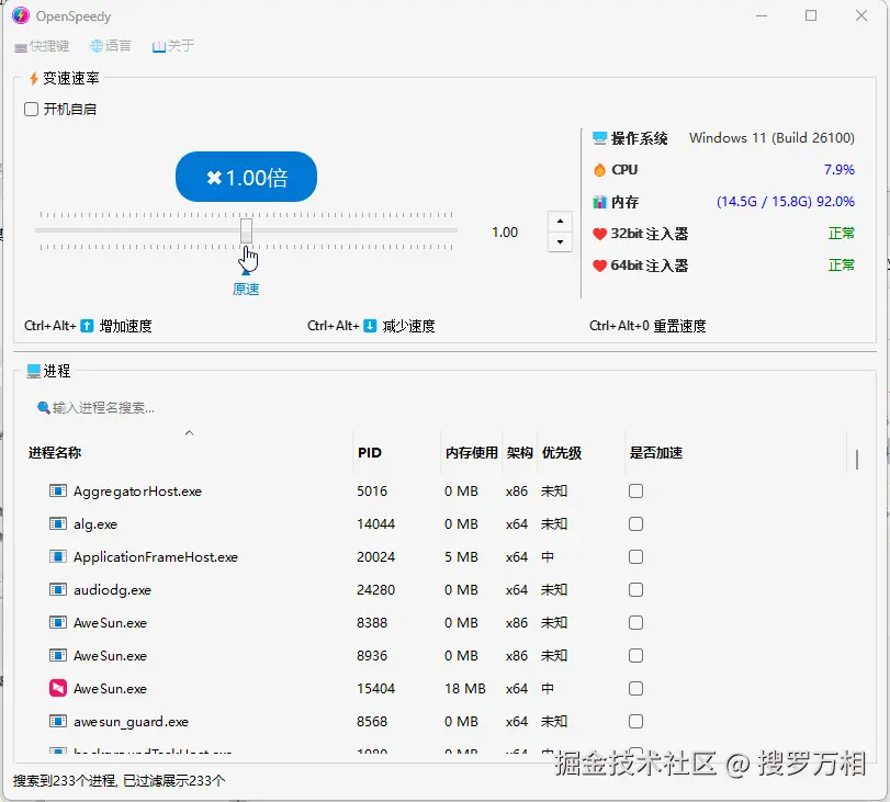 界面设计得非常简洁,一点都不复杂。打开后,主要分为上下两部分:上面是变速速率的调节,下面则是系统进程的列表。