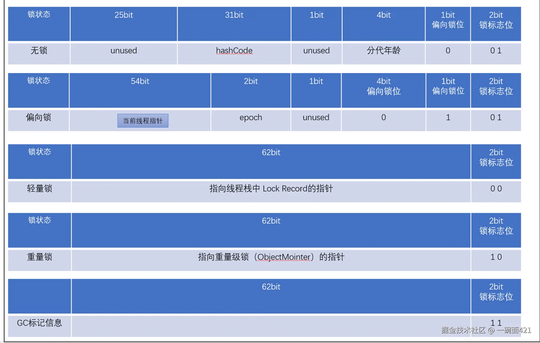 java中使用一个对象来作为一把锁,其锁的状态分为4种(由轻到重):无锁->偏向锁->轻量锁->重量锁,锁状态的标志位就存储在对象头的Mark Word中最后2个比特位。