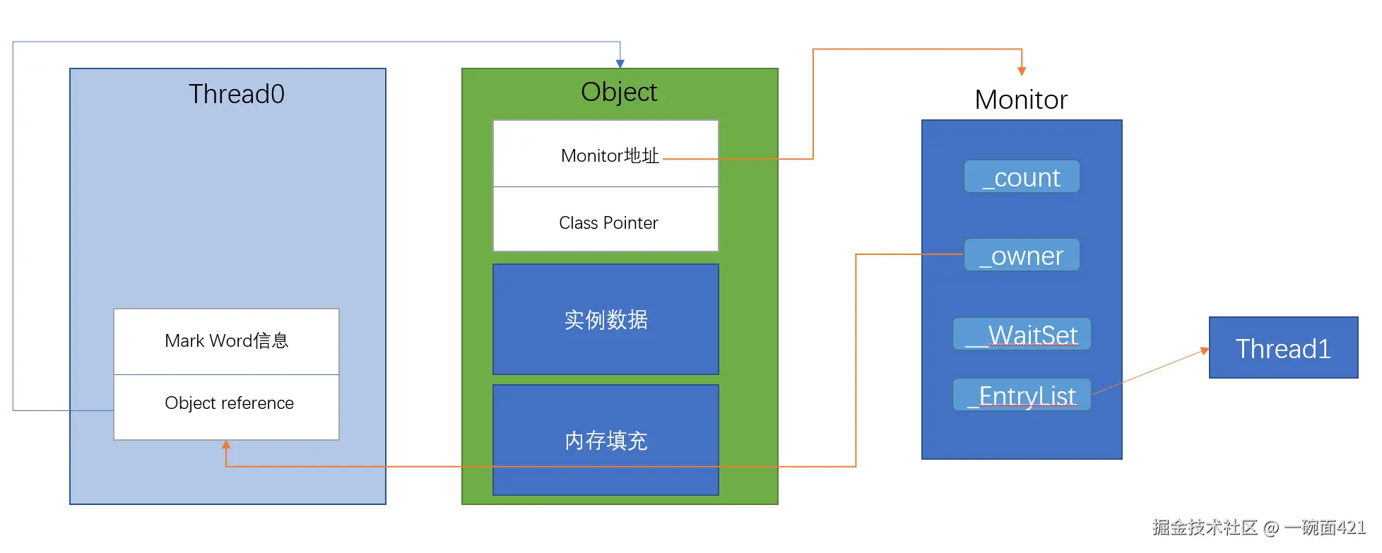 - 此时,线程会进入重量级解锁流程:通过对象头找到对应的 ObjectMonitor,将 Monitor 的 Owner 设置为 null,并唤醒 Monitor 中 EntryList 队列里的阻塞线程,让它们重新竞争锁。