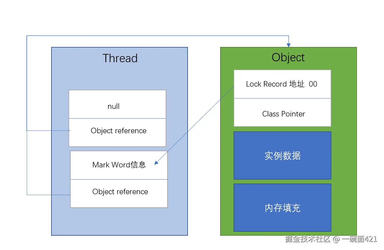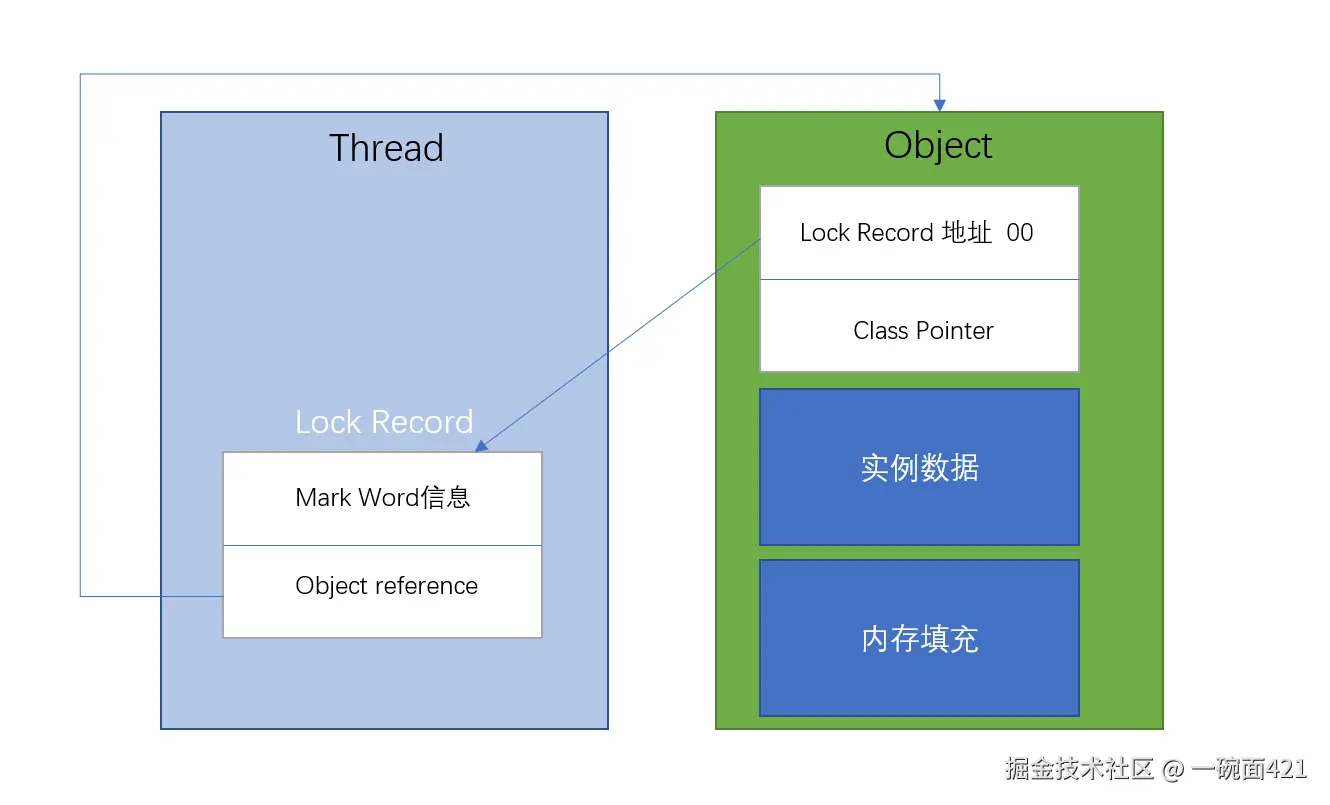 - 对于轻量级锁:JVM会在当前线程的栈帧记录中创建一个锁记录空间。用于存储MarkWord的信息,锁释放后还原回去。