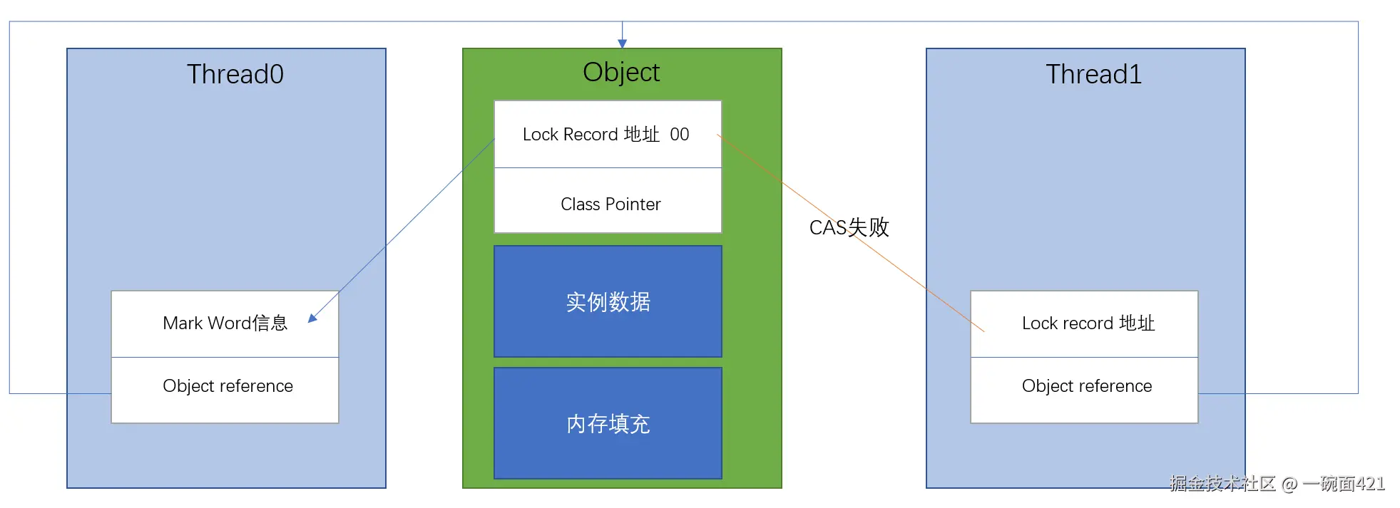 - Thread-1将对象引用指向了Object,然后尝试CAS交换MarkWord,发现Object的MarkWord 最后两位已经是00了,已经被其他轻量级锁占用了。所以Thread-1CAS失败。
