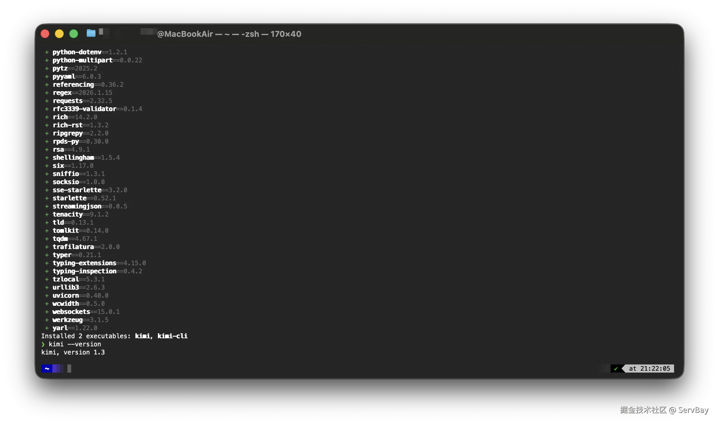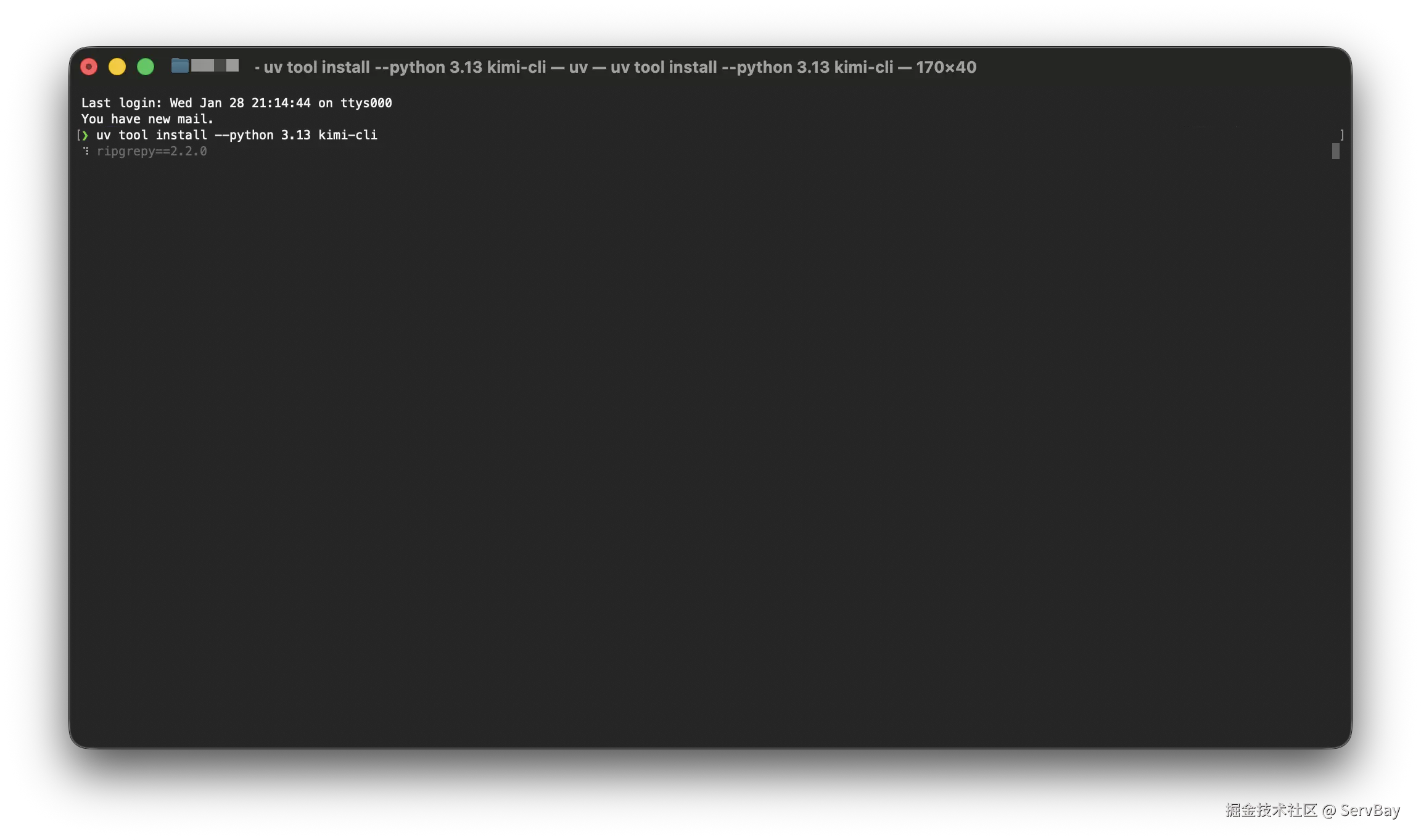 有了 ServBay 提供的 Python 环境后,需要先安装 uv。uv 是一个极速的 Python 包管理器,也是 Kimi Code 官方推荐的底层工具。在终端执行: