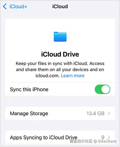 在 iPhone 上,前往 “设置” >“ [您的姓名] ”>“ iCloud ”,向下滚动,然后点击“ iCloud 云盘”。确保“同步此 iPhone ”(或“iCloud 云盘”)已打开。您还可以允许单个应用将数据存储在 iCloud 中。