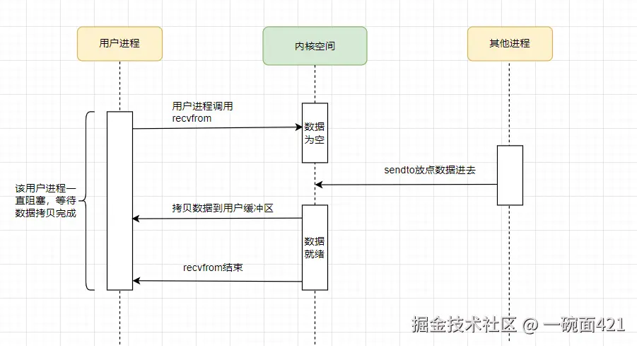 阻塞IO是最传统的模型,进程发起 recvfrom 调用后,会一直阻塞,直到数据准备好并拷贝到用户空间。