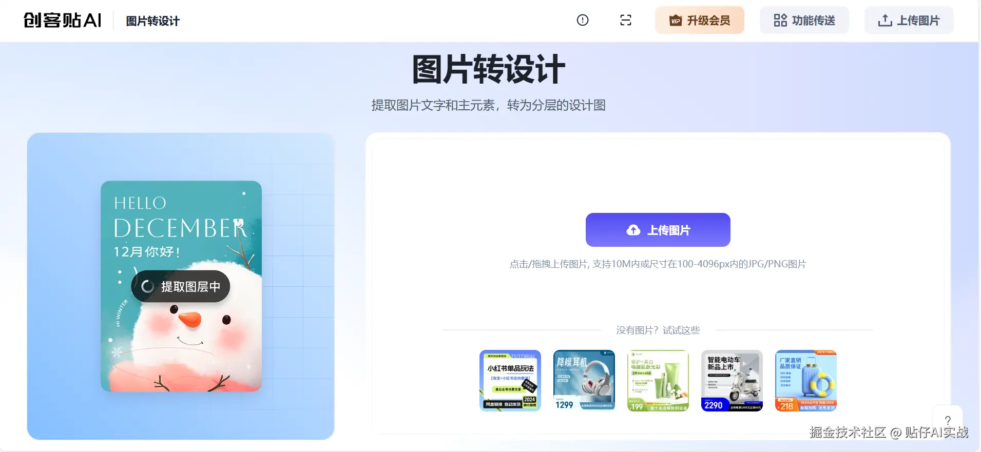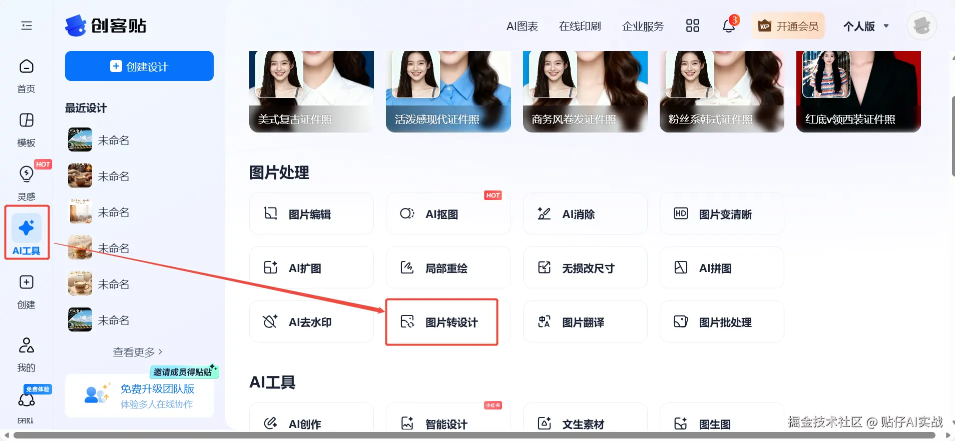 在创客贴首页,点击**「AI工具」,找到「图片转设计」**功能,在功能页点击上传需要分层的图片即可进行后续处理。