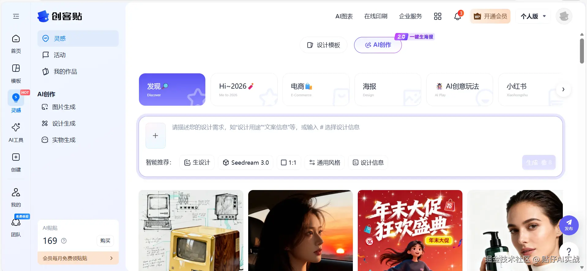 首先,点击此处进入创客贴“灵感”页面,在输入框内输入提示词,选择生成方式(想要生成设计就选择生设计)、风格和尺寸比例,点击成成;