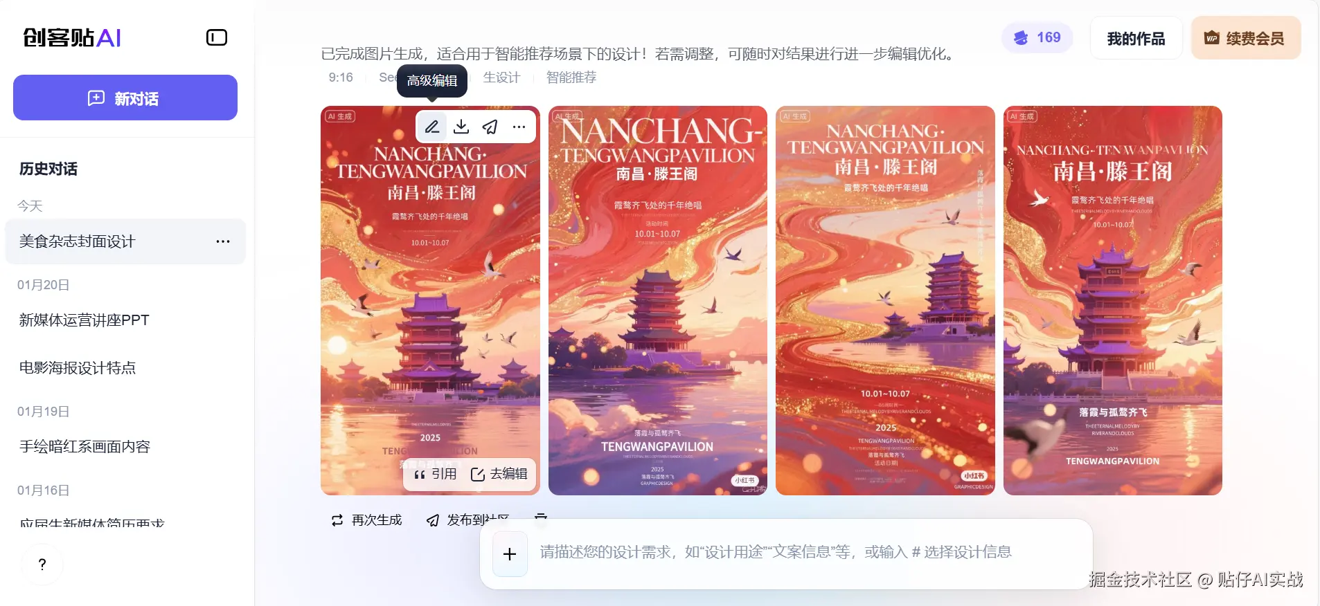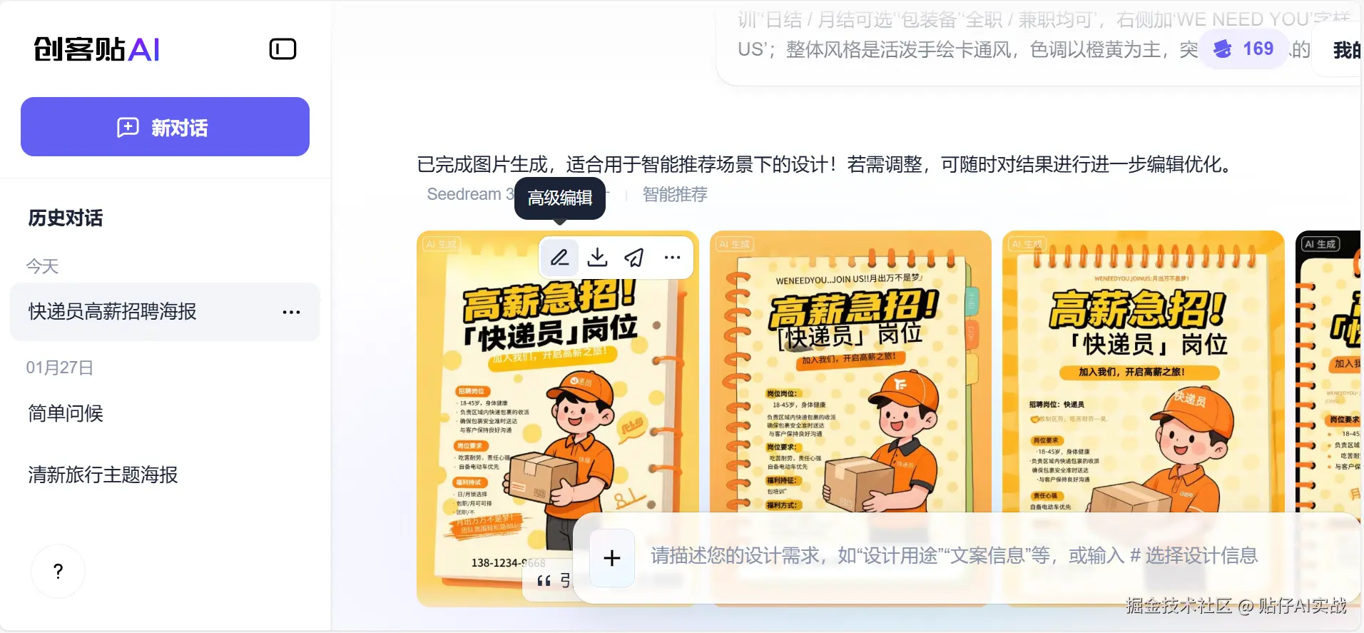 生成完成后,只需点击一个按钮即可进一步修改编辑,让生成的好创意不再浪费。