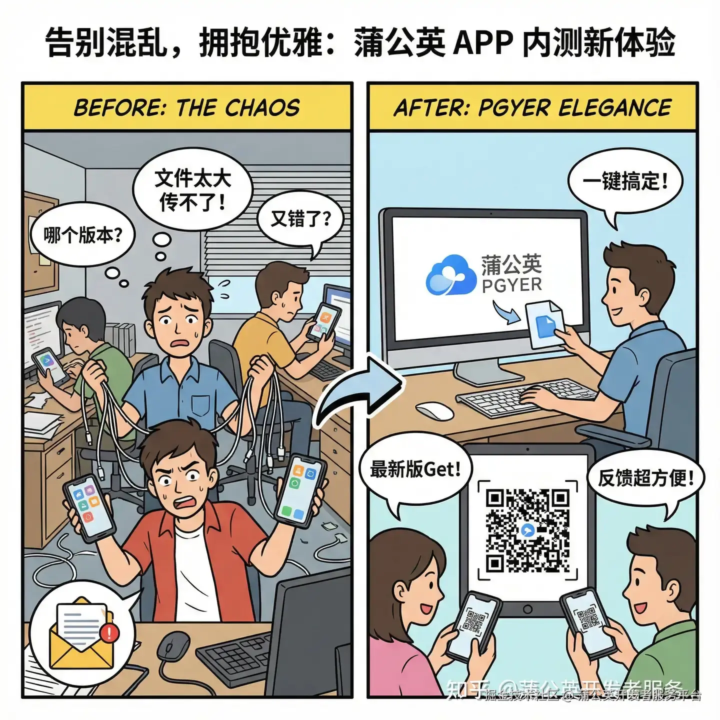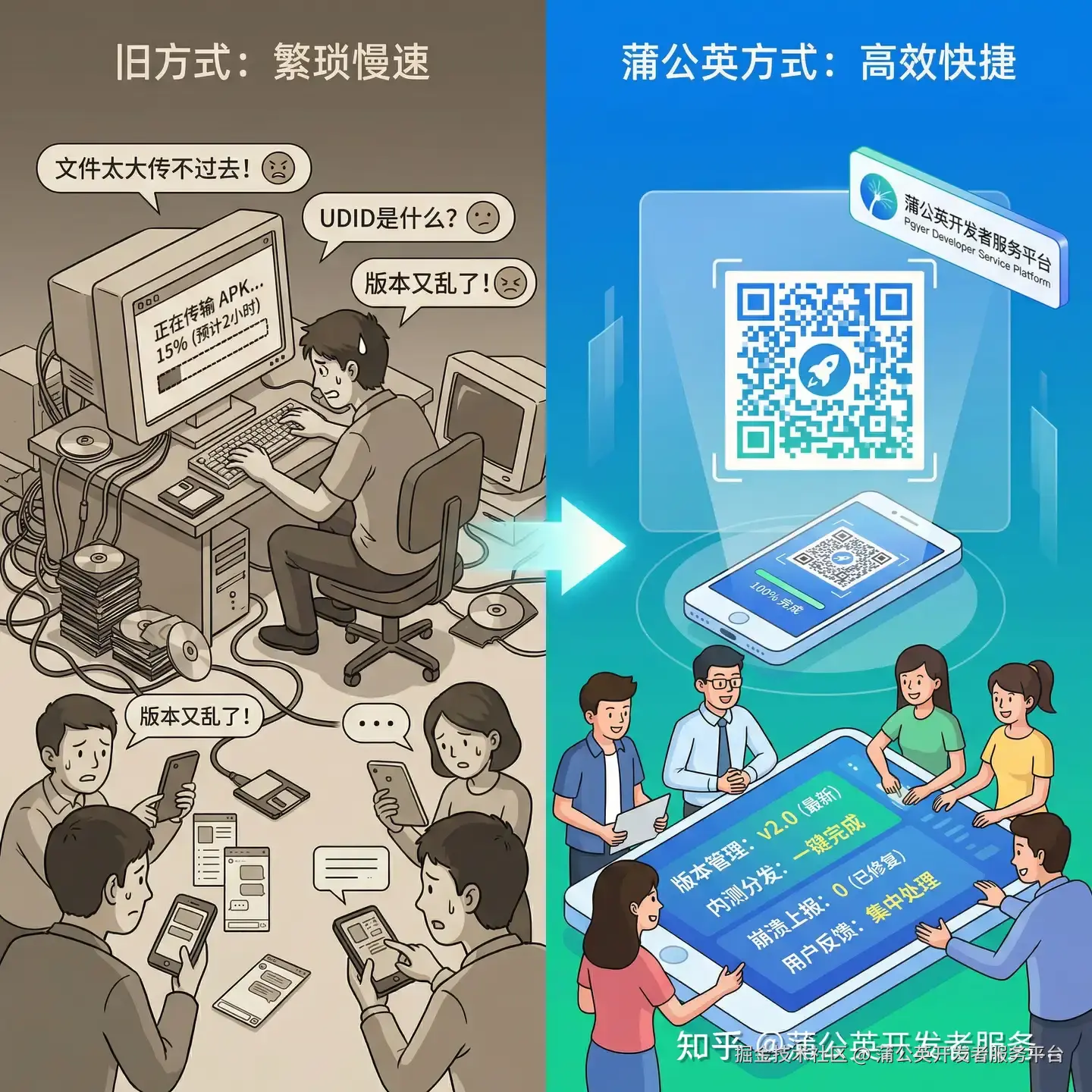 “测试的同学,最新的Android包发群里了,大家更新一下!” “iOS的包呢?哦对,要先收集UDID,一个个来啊,我手动添加到后台…” “产品经理A:这个按钮的反馈有点奇怪。我:哪个版本?什么机型?有日志吗?A:我忘了…” “用户B:昨天那个Bug还在吗?我:我发你个新包,你再试试?B:链接过期了…”