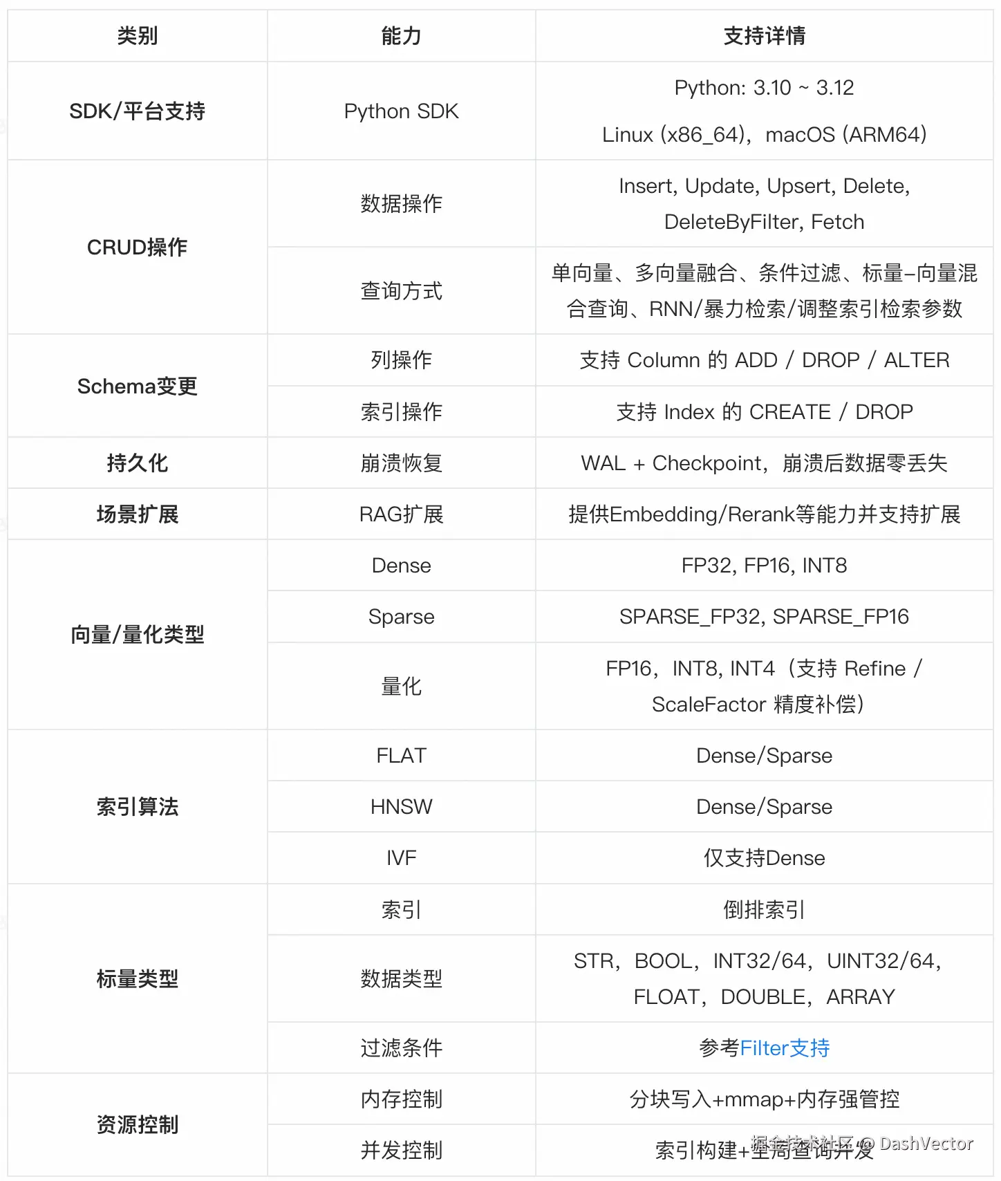 - 标量字段可选建倒排索引,加速等值/范围过滤,进一步优化混合检索性能。
