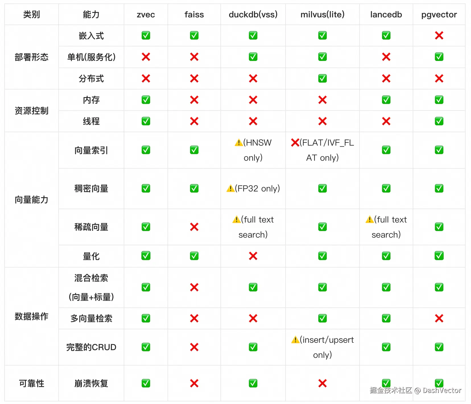- 纯索引库(如Faiss):缺乏标量属性存储、混合查询、完整 CRUD 以及崩溃恢复等数据库能力,需大量外围工程实现生产级功能,工程成本显著;