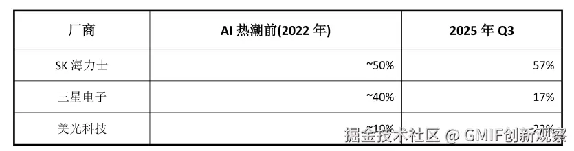 凭借与NVIDIA的深度绑定和HBM3、HBM3E产品的先发优势,SK海力士迅速主导了市场。其财务数据也迎来了历史性的高光时刻。HBM市场的竞争格局在AI热潮前后发生了戏剧性的变化,深刻地反映了三星的战略失误和美光的迅速崛起。