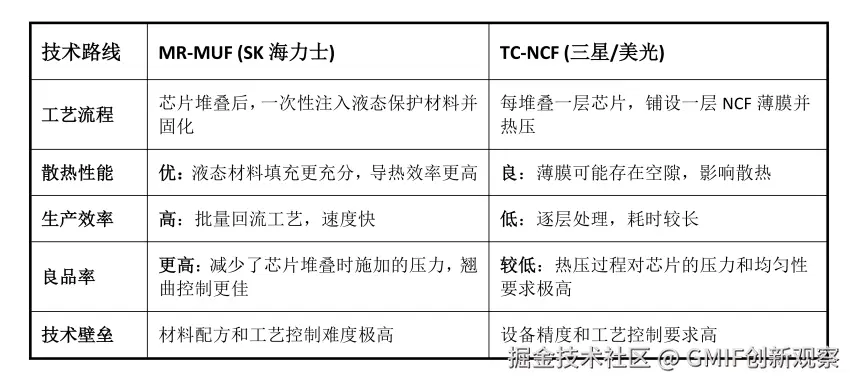 这与竞争对手三星和美光采用的TC-NCF(Thermal Compression Non-Conductive Film,热压非导电薄膜)技术路线截然不同。TC-NCF需要在每层芯片之间都铺上一层薄膜,然后通过热压进行键合。