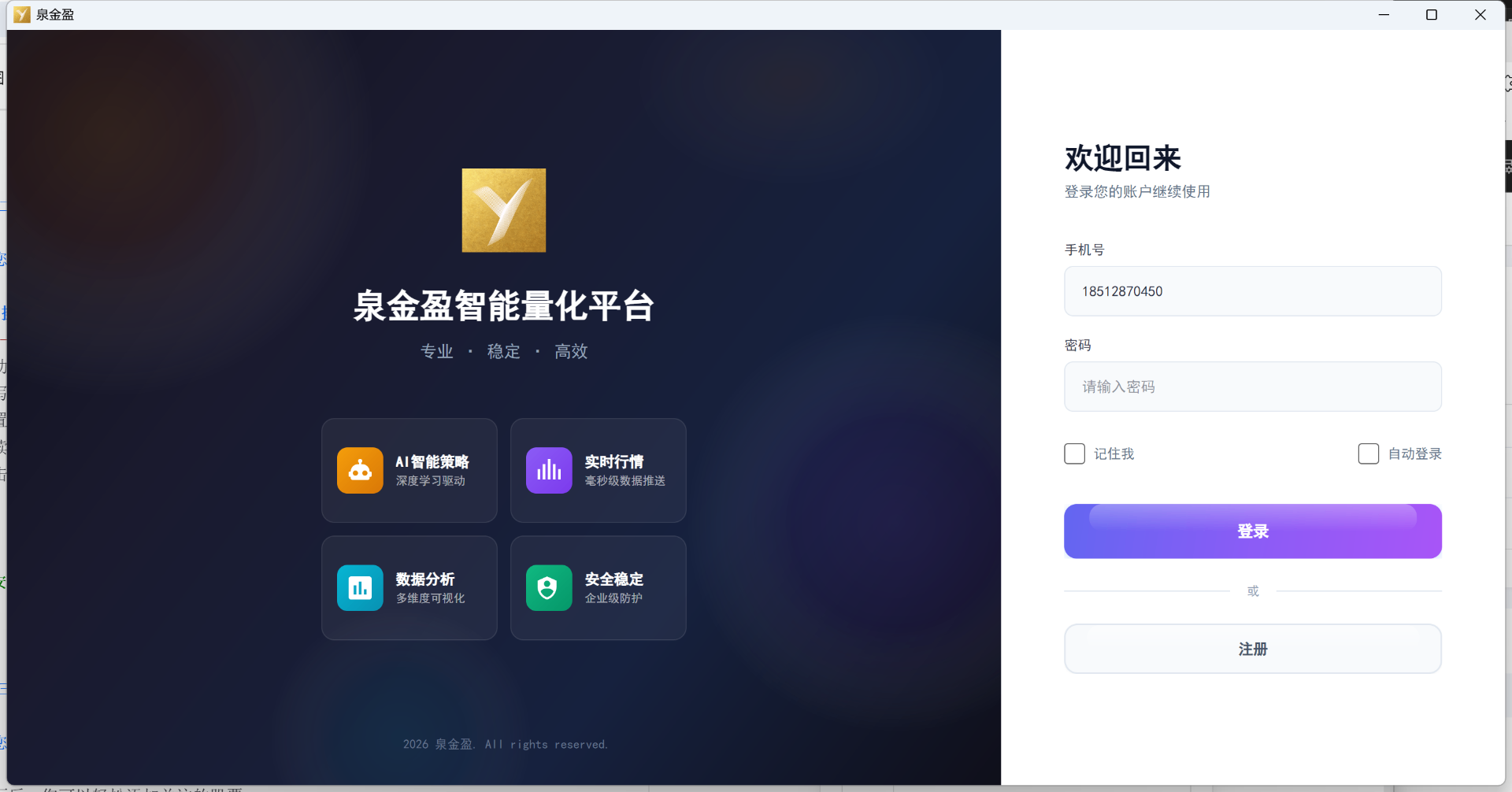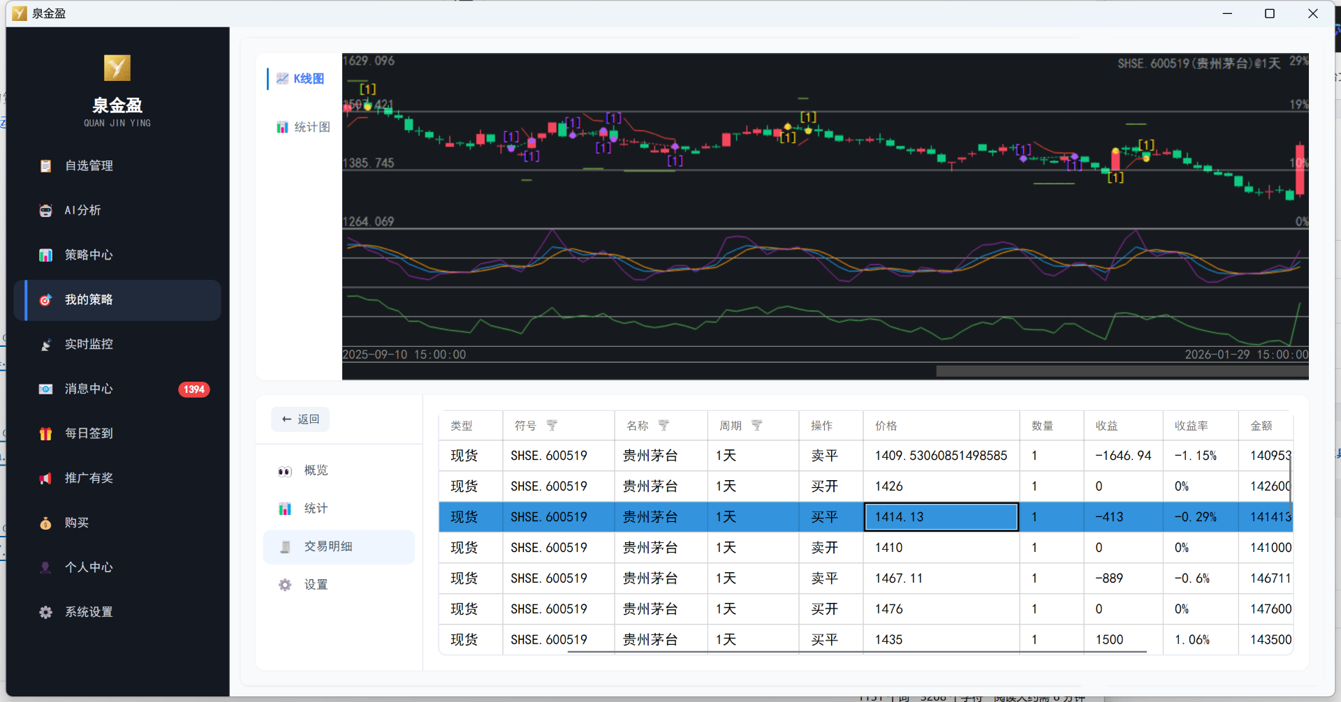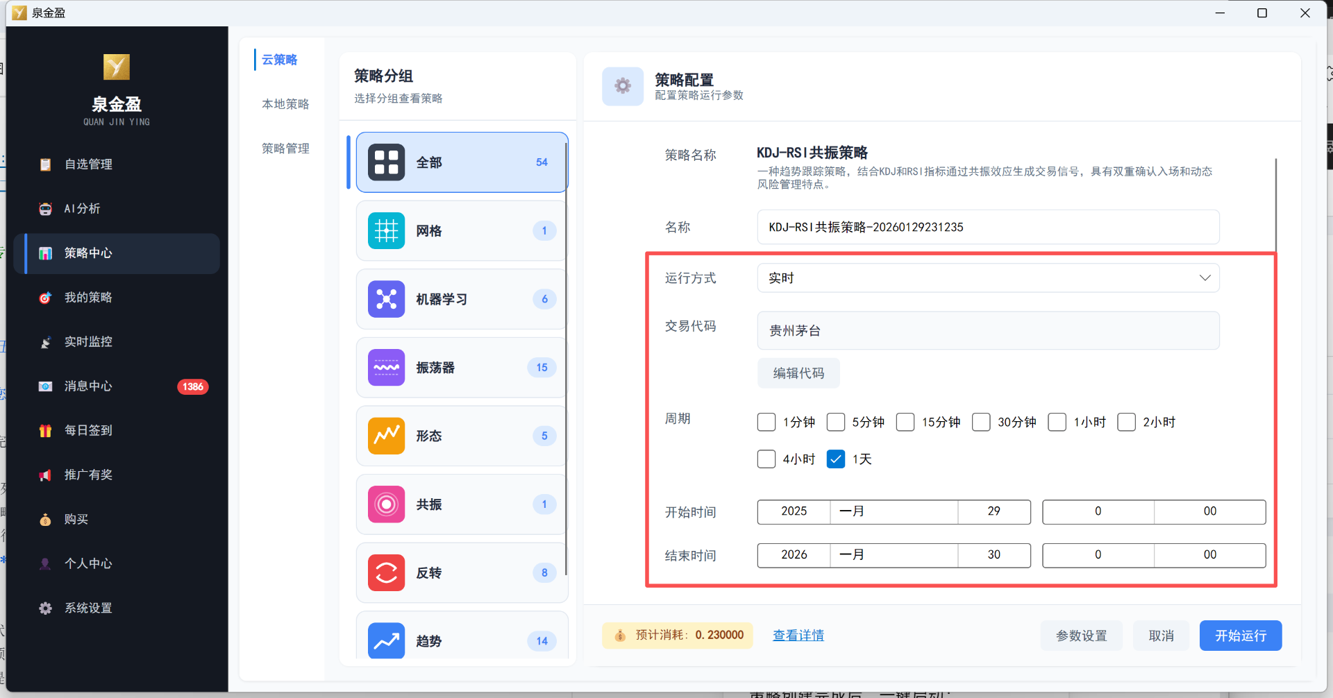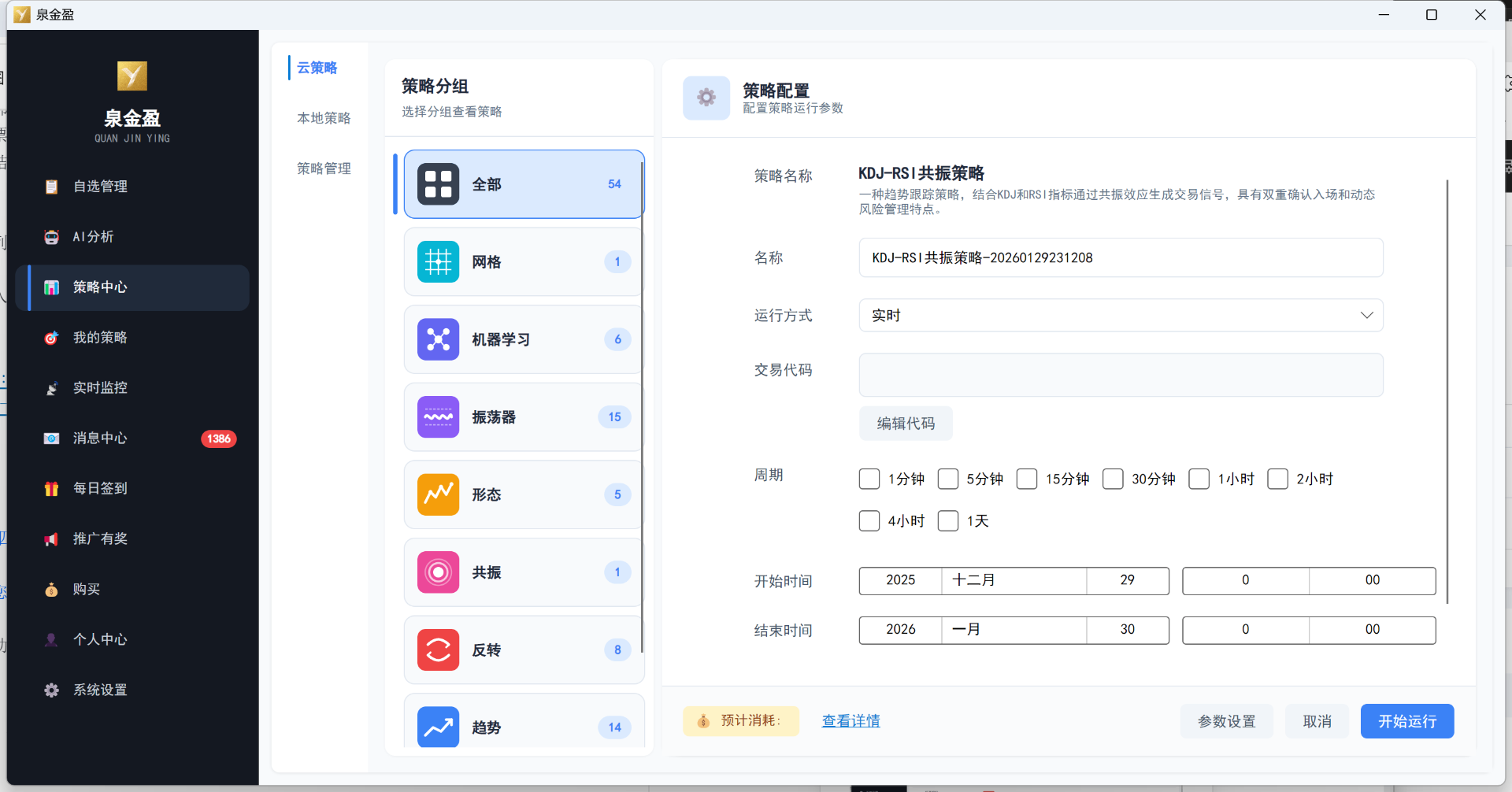 泉金盈作为新一代量化交易平台,以全新的云策略形式,重新定义个人投资者的交易方式——无需复杂编程,无需专业背景,无论您是初入市场的新人小白,还是经验丰富的行业老手,都能在 3分钟内 快速创建并运行一个策略,通过回测或实时运行验证您的指标或交易策略是否有效。